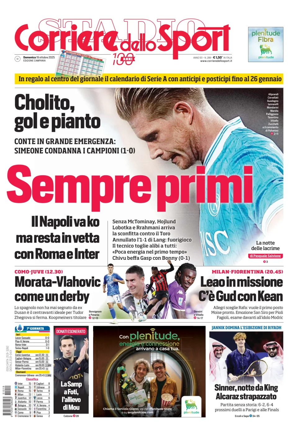 Qui di seguito vi riportiamo la prima pagina dell'edizione Campania del quotidiano 'Il Corriere dello Sport' che troverete in edicola il giorno 19 ottobre 2025.