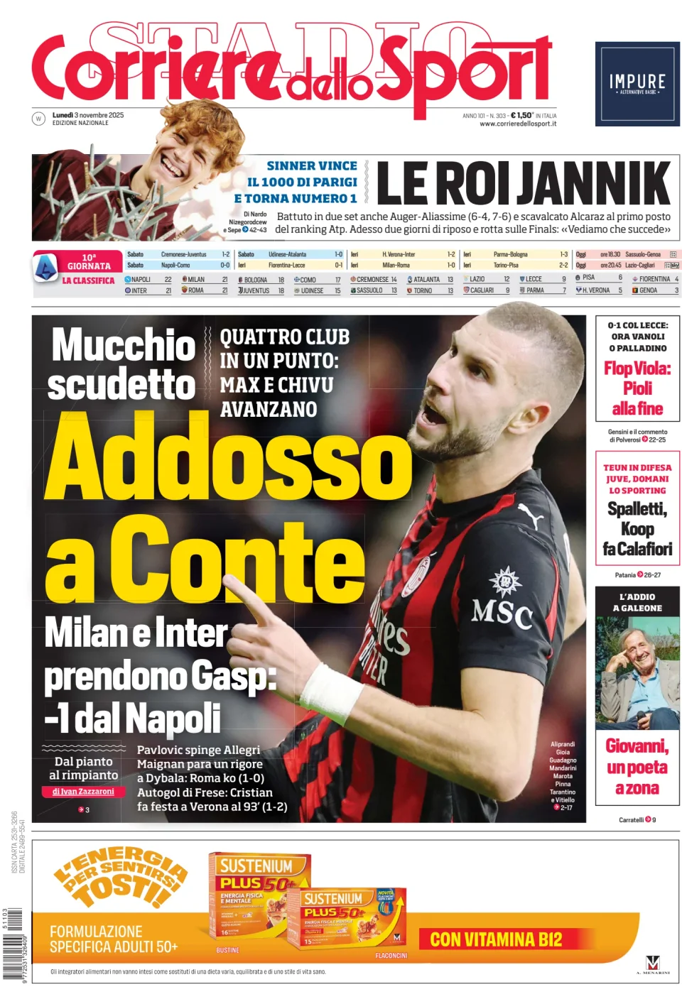 Di seguito potete trovare le prime pagine dei tre quotidiani sportivi, relativamente alle edizioni Nazionali in edicola il giorno 3 novembre 2025.