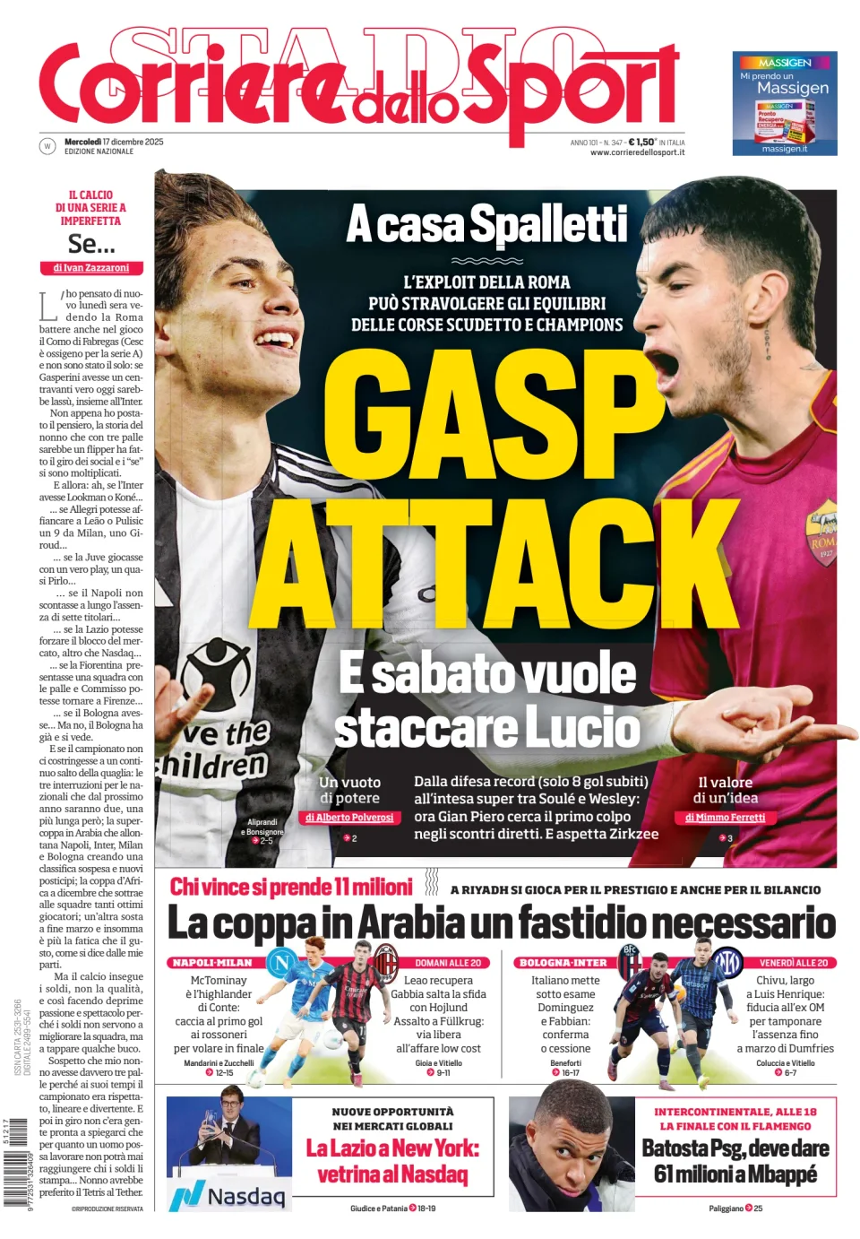 Di seguito potete trovare le prime pagine dei tre quotidiani sportivi, relativamente alle edizioni Nazionali in edicola il giorno 17 dicembre 2025.