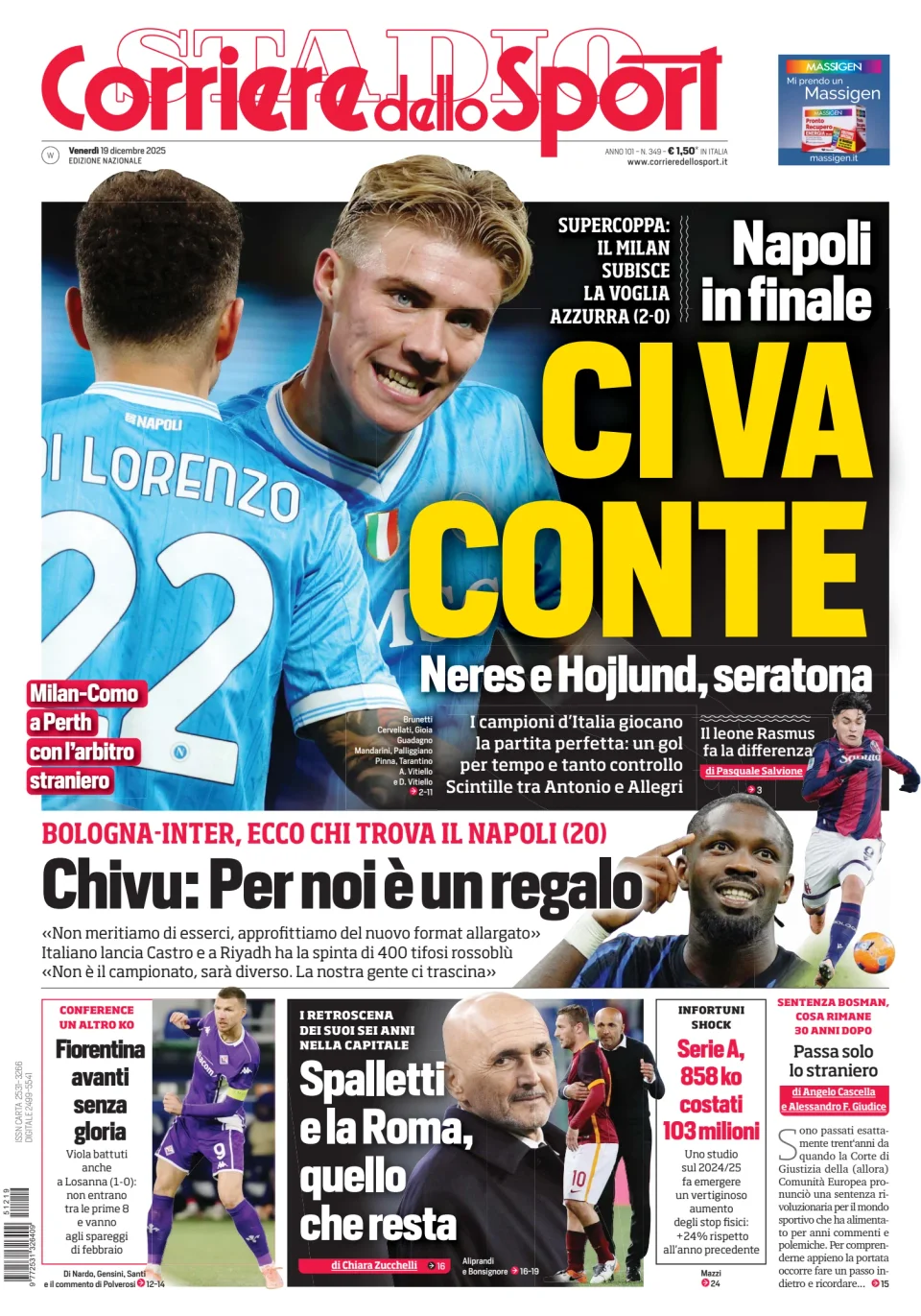 Di seguito potete trovare le prime pagine dei tre quotidiani sportivi, relativamente alle edizioni Nazionali in edicola il giorno 19 dicembre 2025.