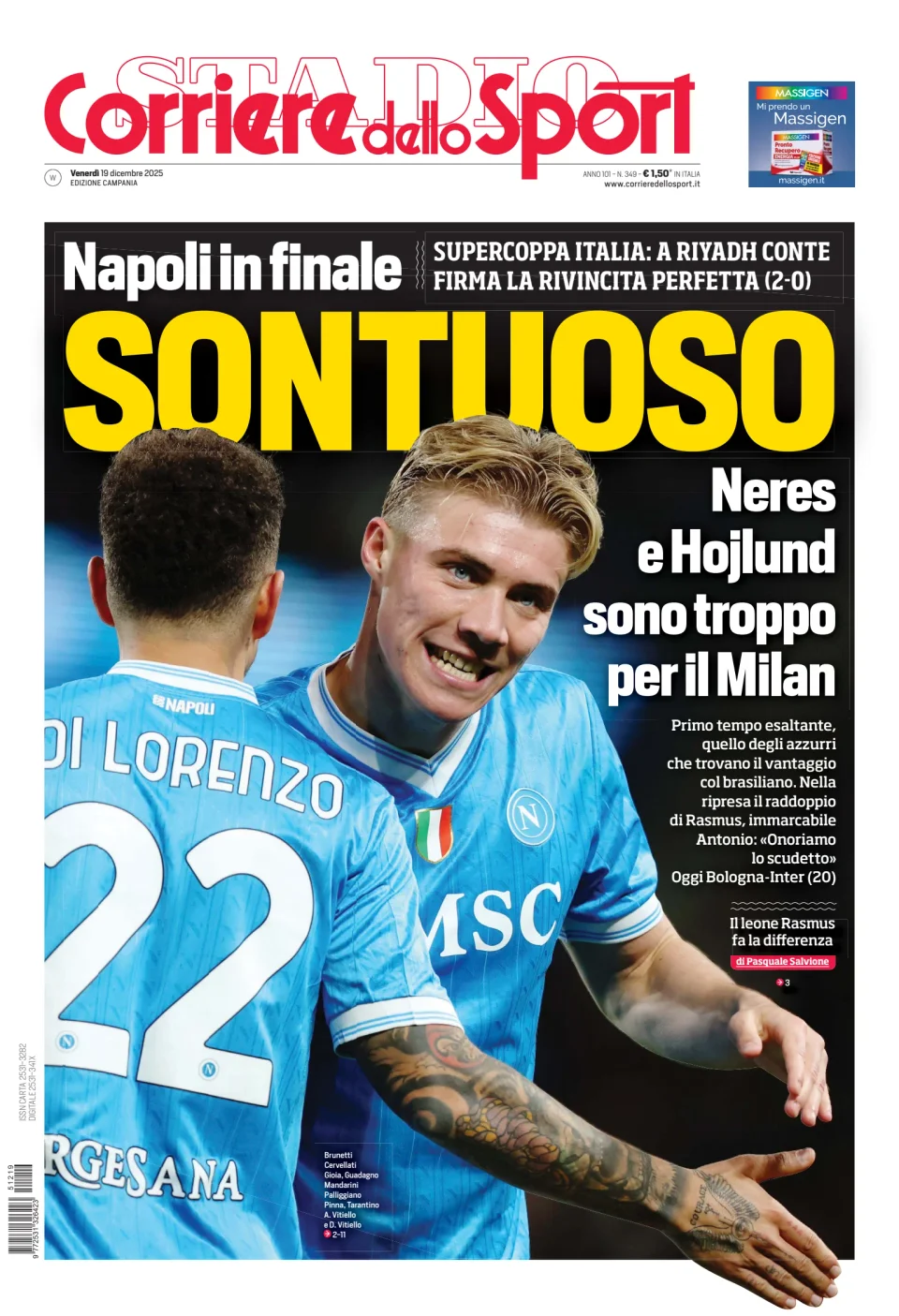 Qui di seguito vi riportiamo la prima pagina dell'edizione Campania del quotidiano 'Il Corriere dello Sport' che troverete in edicola il giorno 19 dicembre 2025.