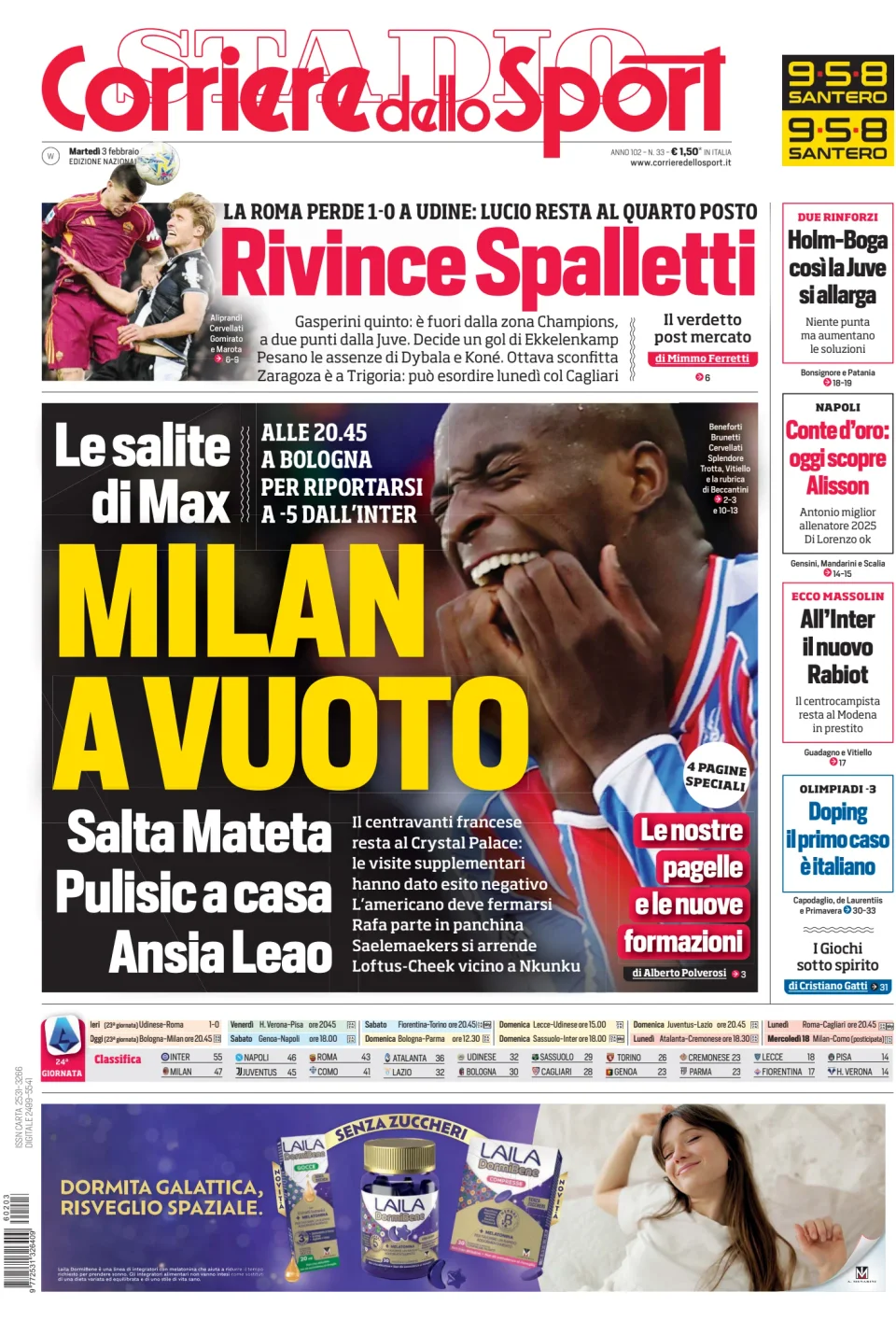 RASSEGNA STAMPA SPORTIVA - Prime pagine dei quotidiani del 3 febbraio 2026