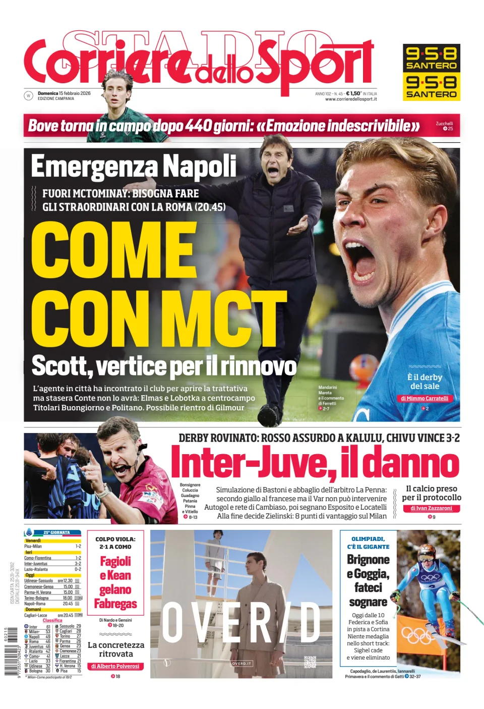 Qui di seguito vi riportiamo la prima pagina dell'edizione Campania del quotidiano 'Il Corriere dello Sport' che troverete in edicola il giorno 15 febbraio 2026.