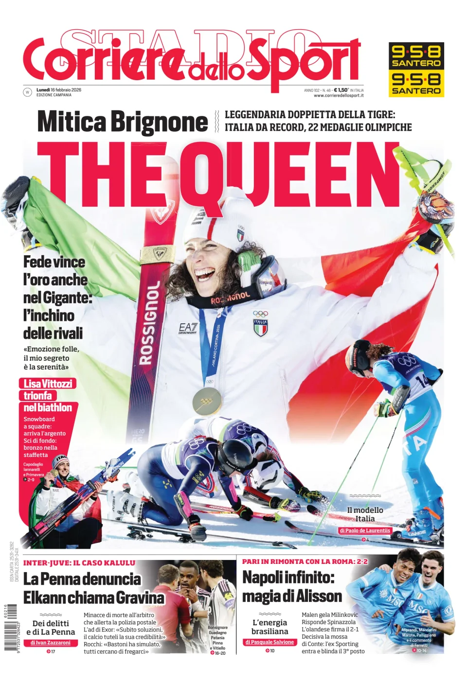 Qui di seguito vi riportiamo la prima pagina dell'edizione Campania del quotidiano 'Il Corriere dello Sport' che troverete in edicola il giorno 16 febbraio 2026.