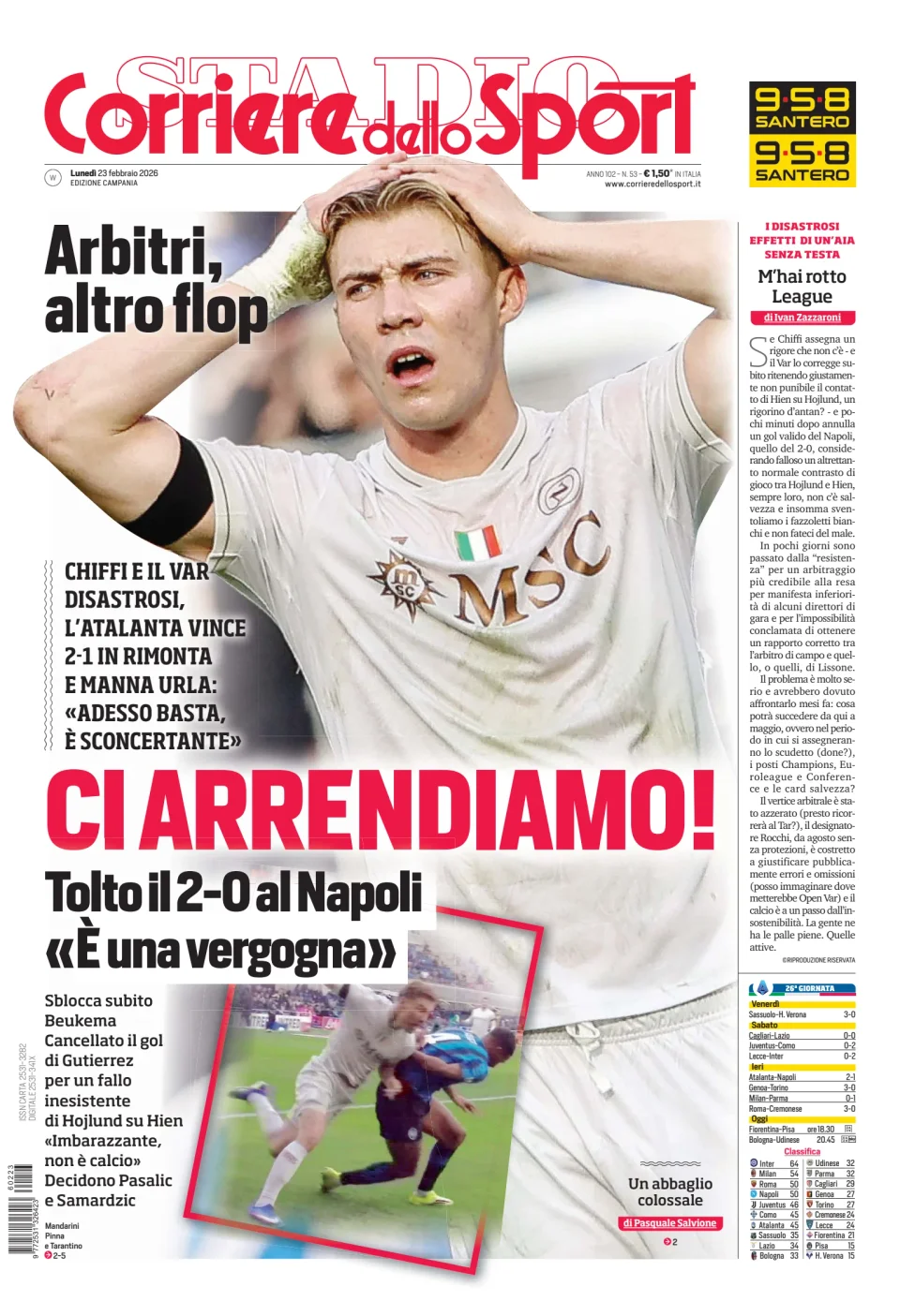Qui di seguito vi riportiamo la prima pagina dell'edizione Campania del quotidiano 'Il Corriere dello Sport' che troverete in edicola il giorno 23 febbraio 2026.