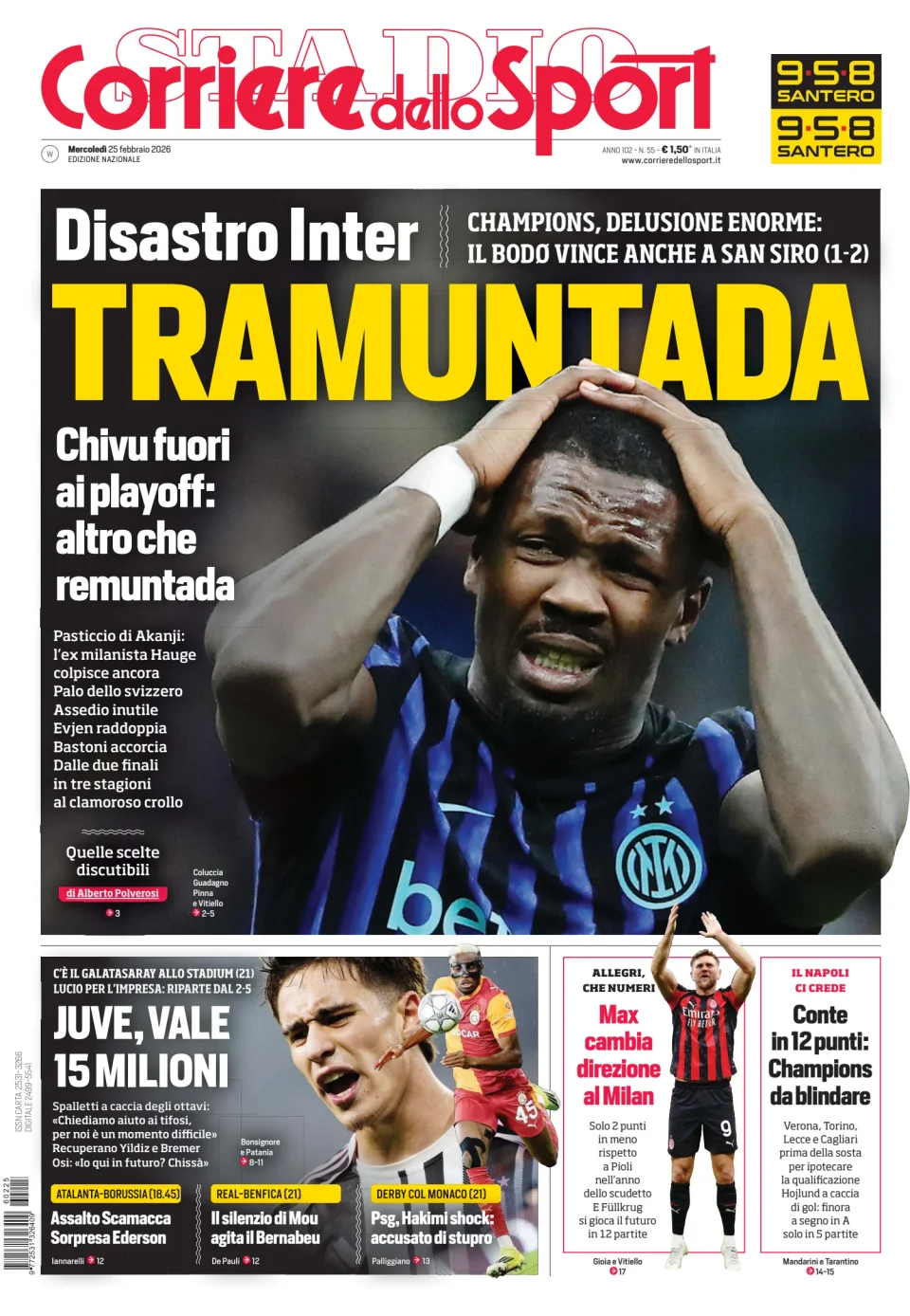 Di seguito potete trovare le prime pagine dei tre quotidiani sportivi, relativamente alle edizioni Nazionali in edicola il giorno 25 febbraio 2026.