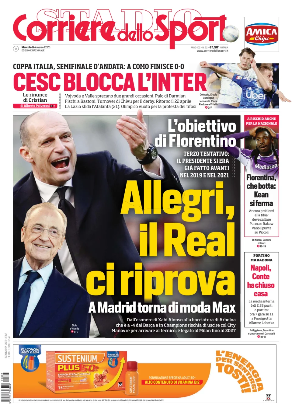 Di seguito potete trovare le prime pagine dei tre quotidiani sportivi, relativamente alle edizioni Nazionali in edicola il giorno 4 marzo 2026.