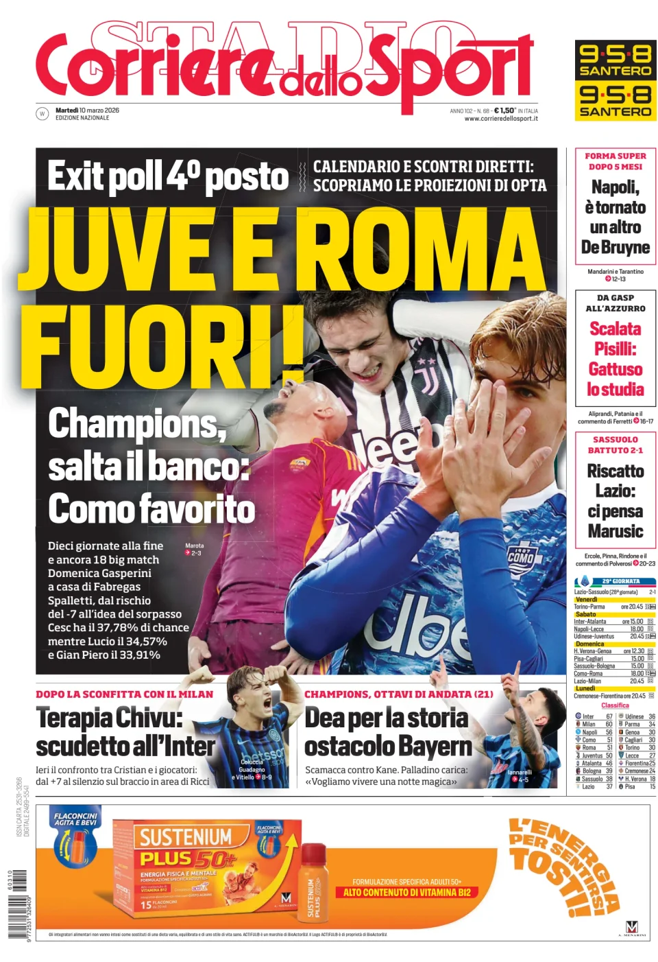 Di seguito potete trovare le prime pagine dei tre quotidiani sportivi, relativamente alle edizioni Nazionali in edicola il giorno 10 marzo 2026.