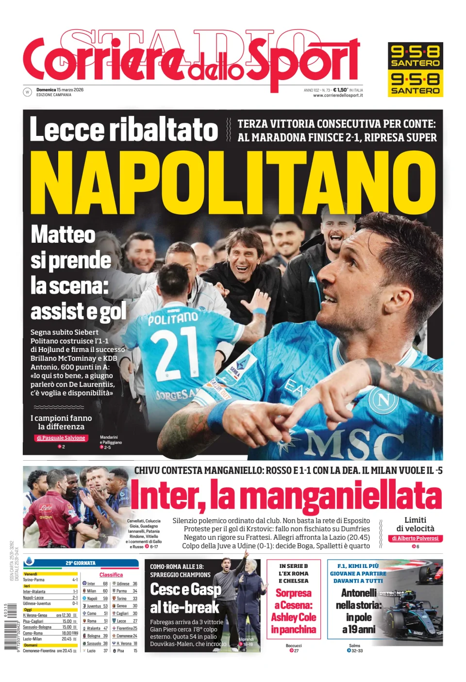 Qui di seguito vi riportiamo la prima pagina dell'edizione Campania del quotidiano 'Il Corriere dello Sport' che troverete in edicola il giorno 15 marzo 2026.