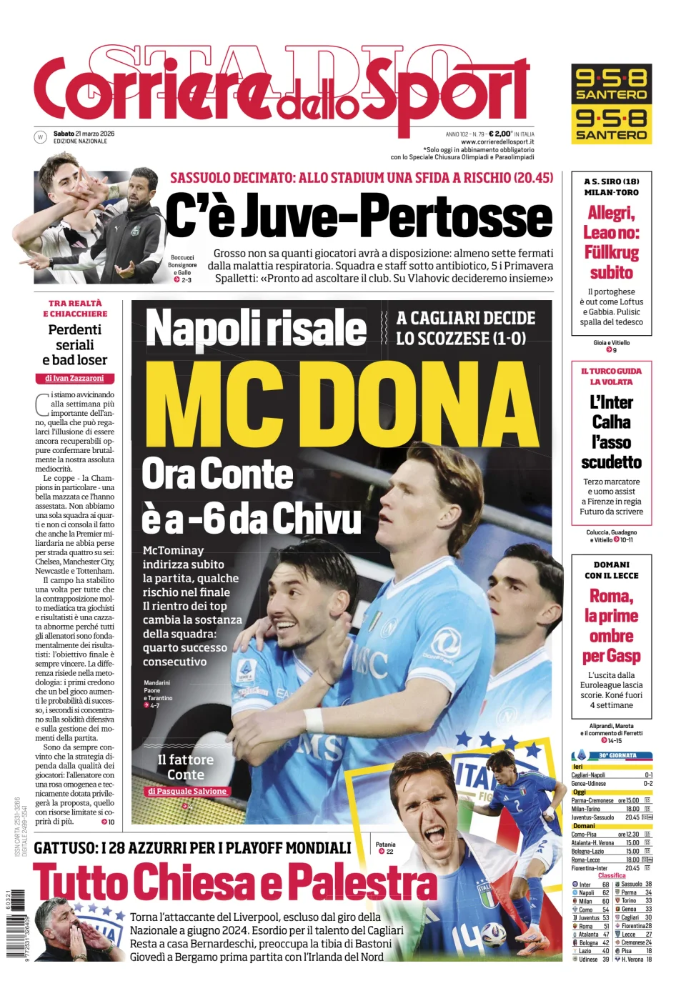 Di seguito potete trovare le prime pagine dei tre quotidiani sportivi, relativamente alle edizioni Nazionali in edicola il giorno 21 marzo 2026.
