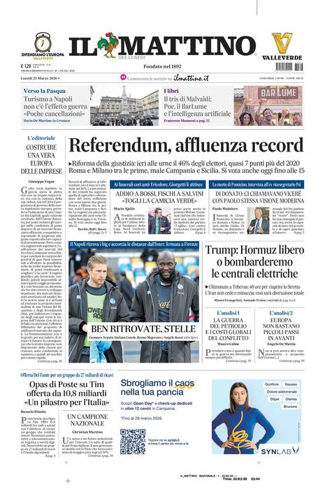 Vi riportiamo la prima pagina del quotidiano napoletano 'Il Mattino' che troverete in edicola il giorno 23 marzo 2026.