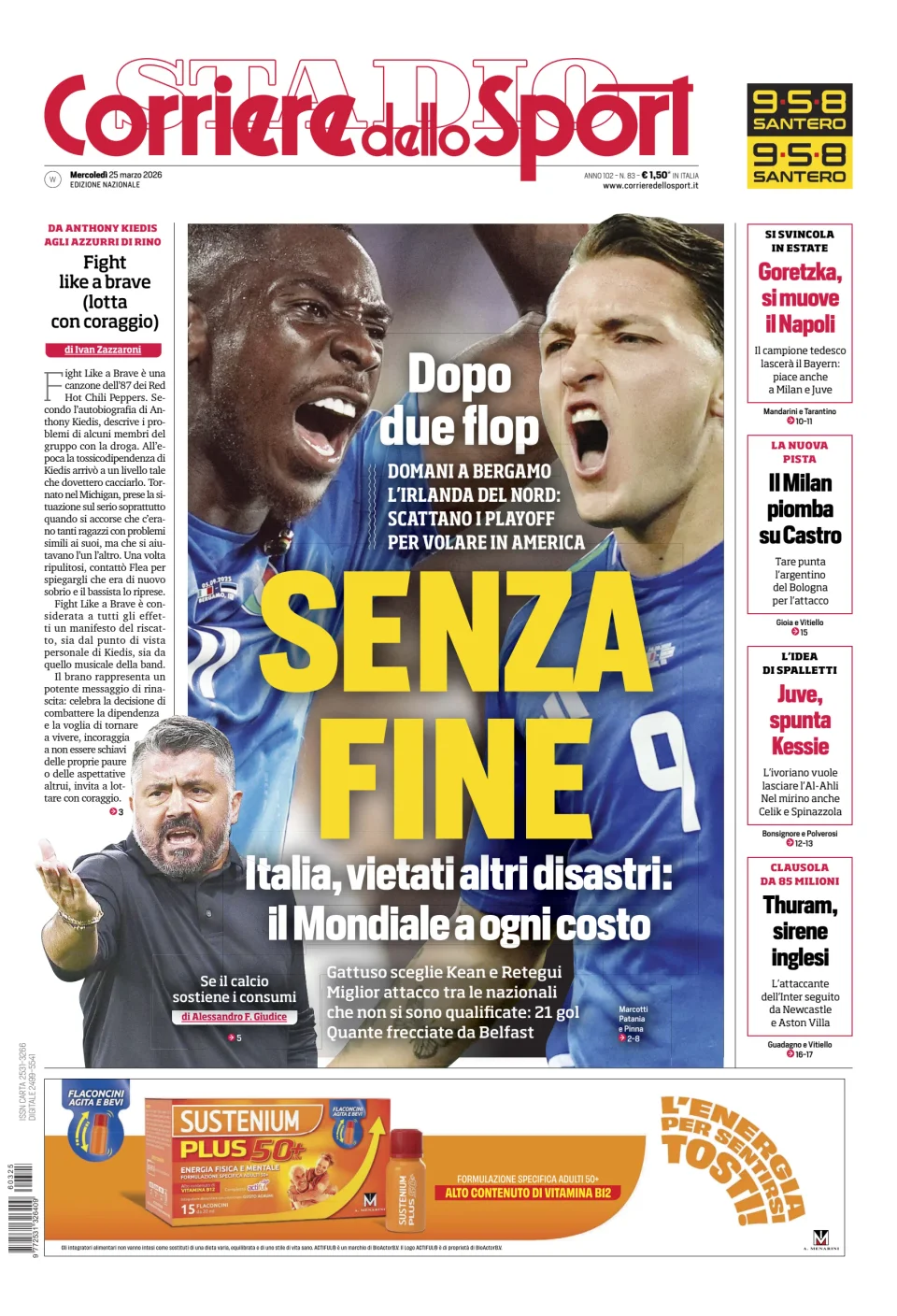 Di seguito potete trovare le prime pagine dei tre quotidiani sportivi, relativamente alle edizioni Nazionali in edicola il giorno 25 marzo 2026.