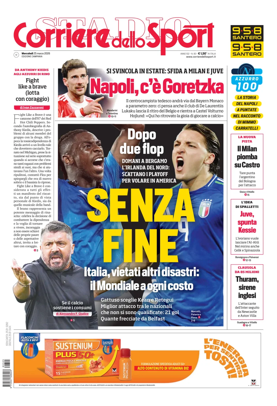 Qui di seguito vi riportiamo la prima pagina dell'edizione Campania del quotidiano 'Il Corriere dello Sport' che troverete in edicola il giorno 25 marzo 2026.