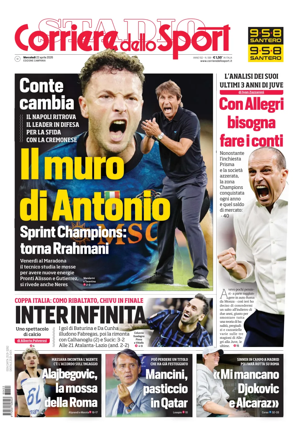 Qui di seguito vi riportiamo la prima pagina dell'edizione Campania del quotidiano 'Il Corriere dello Sport' che troverete in edicola il giorno 22 aprile 2026.