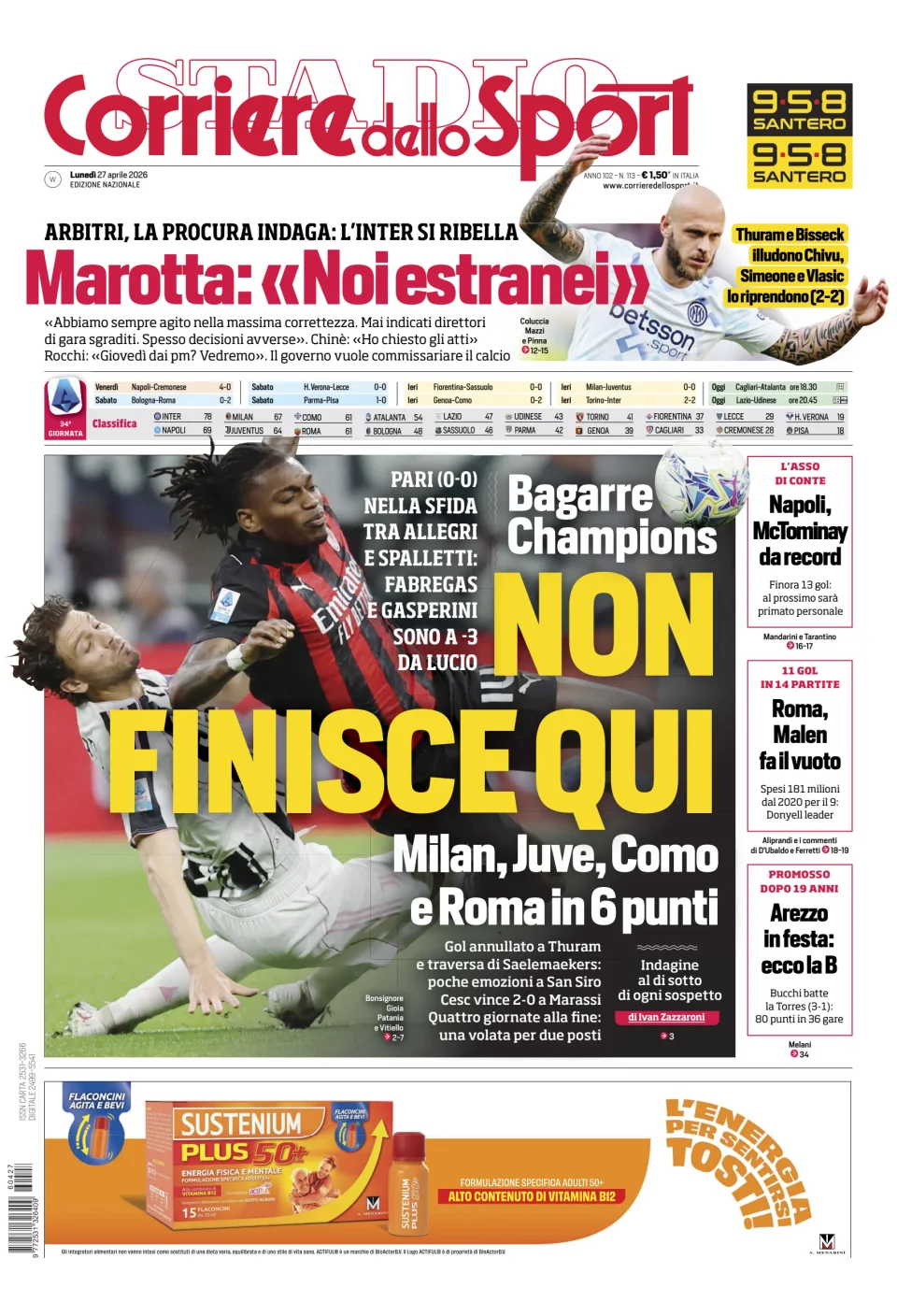 Di seguito potete trovare le prime pagine dei tre quotidiani sportivi, relativamente alle edizioni Nazionali in edicola il giorno 27 aprile 2026.