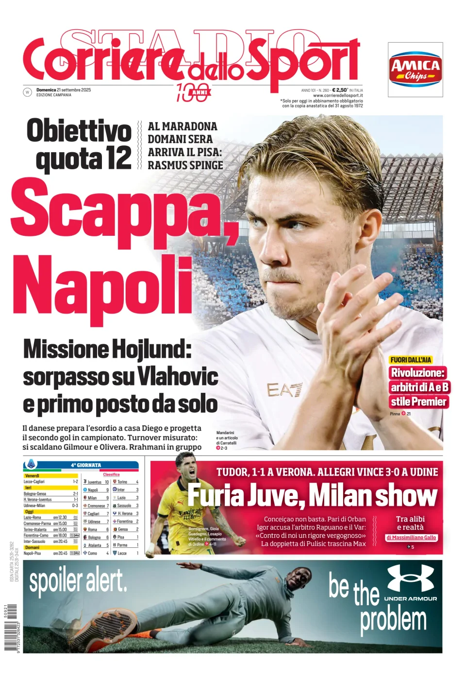 Qui di seguito vi riportiamo la prima pagina dell'edizione Campania del quotidiano 'Il Corriere dello Sport' che troverete in edicola il giorno 21 settembre 2025.