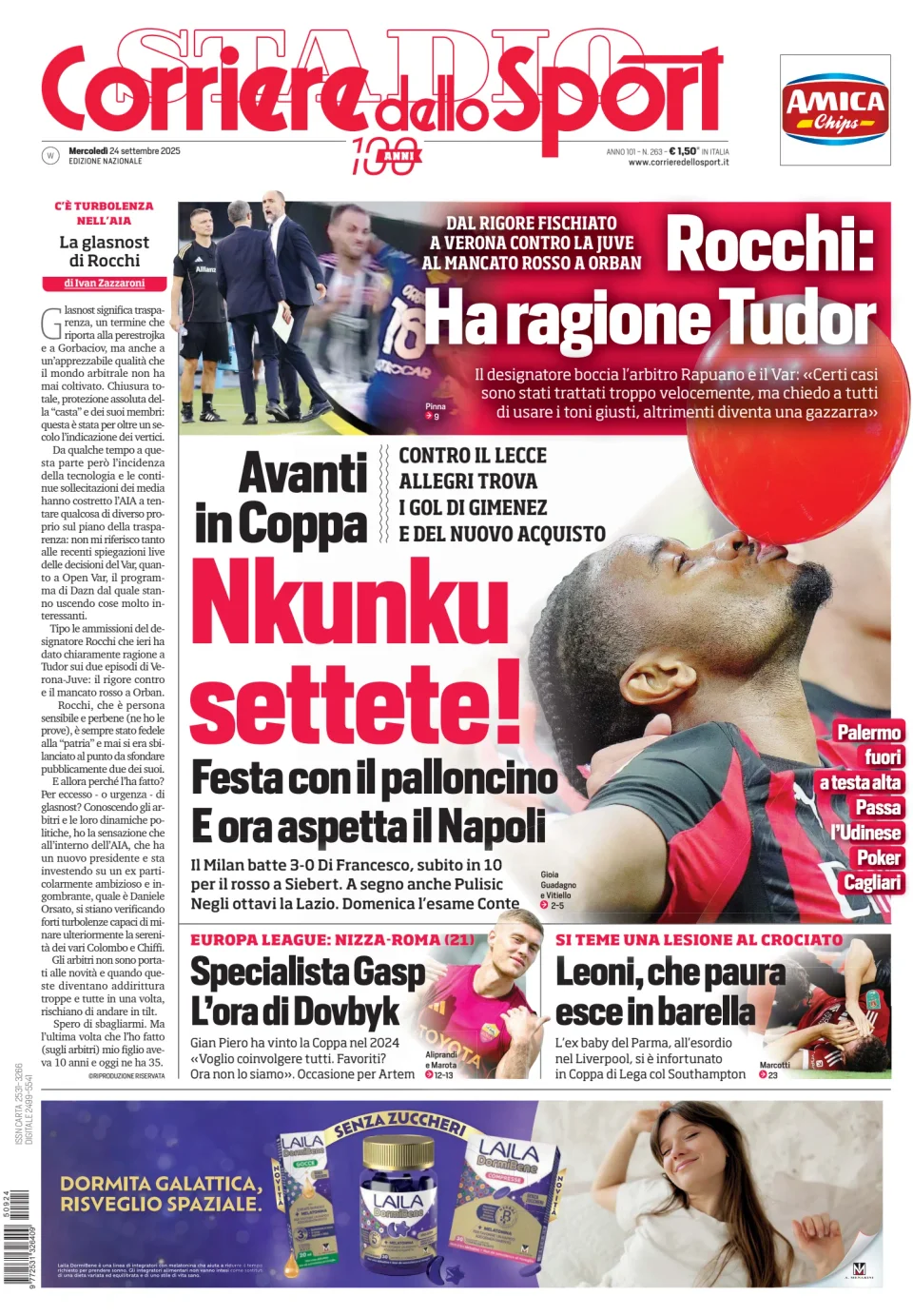 Di seguito potete trovare le prime pagine dei tre quotidiani sportivi, relativamente alle edizioni Nazionali in edicola il giorno 24 settembre 2025.