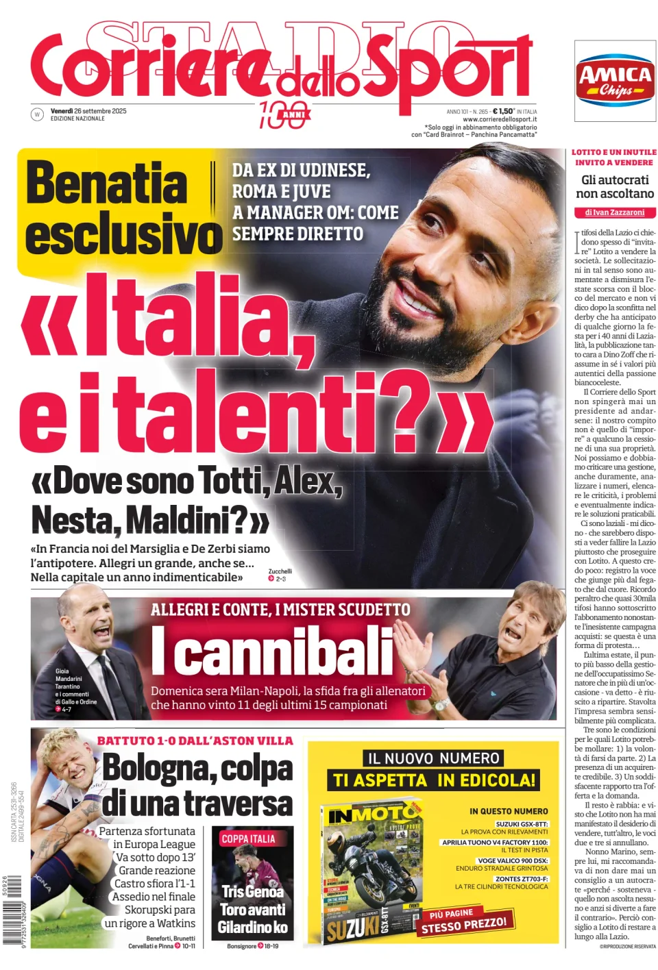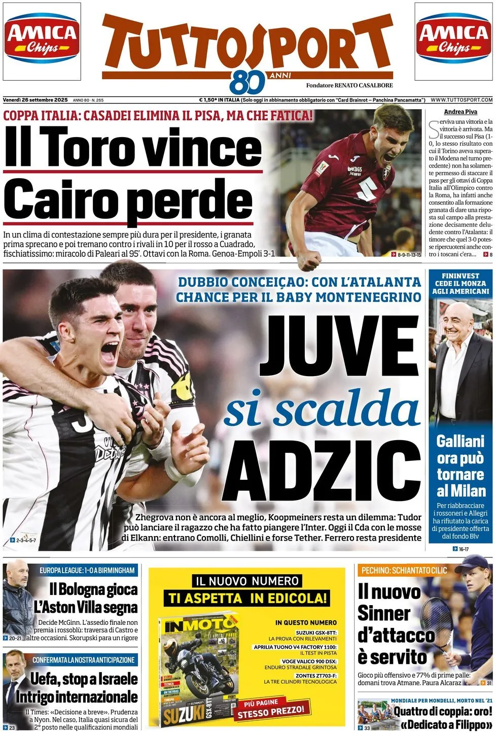 Di seguito potete trovare le prime pagine dei tre quotidiani sportivi, relativamente alle edizioni Nazionali in edicola il giorno 26 settembre 2025.