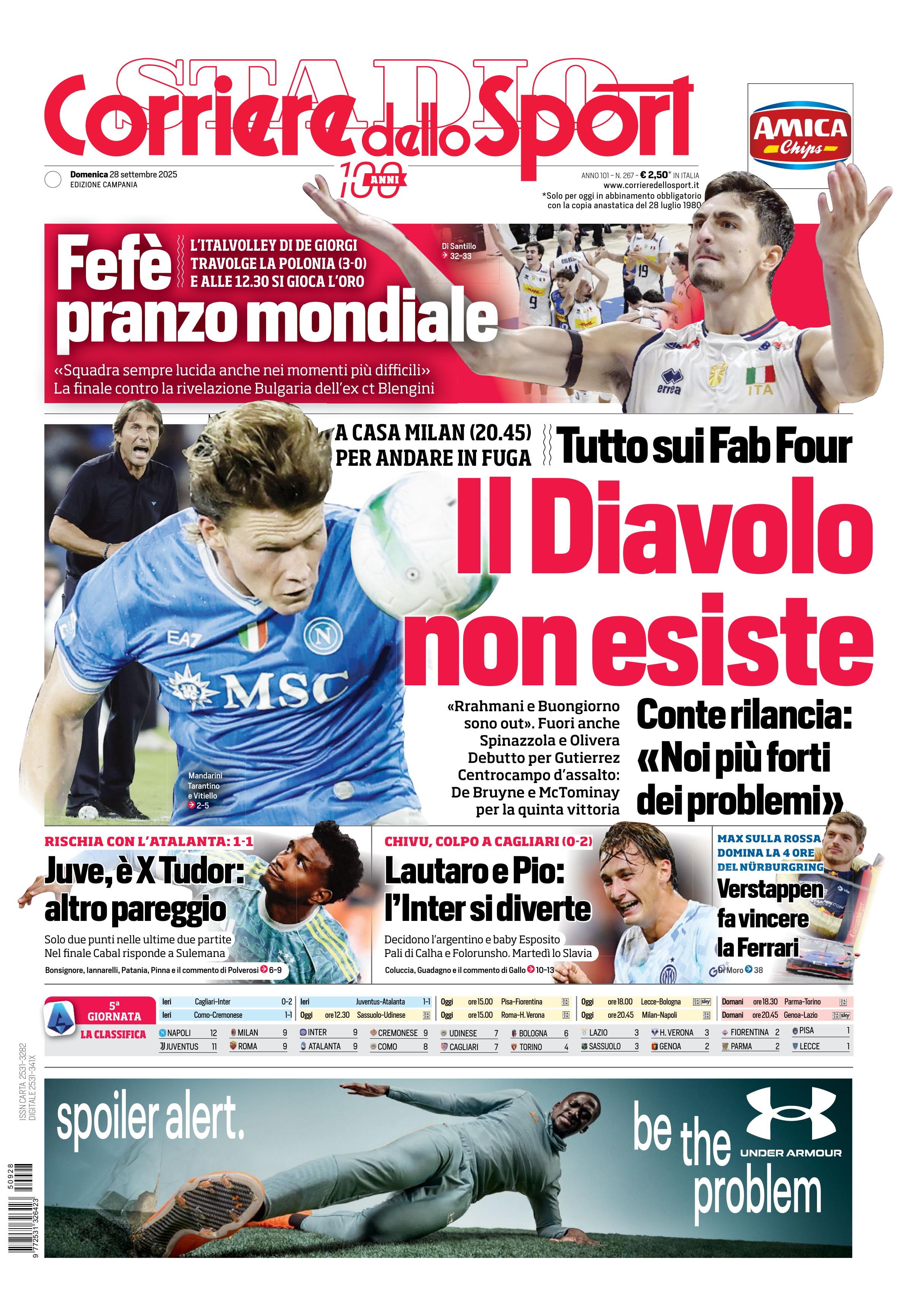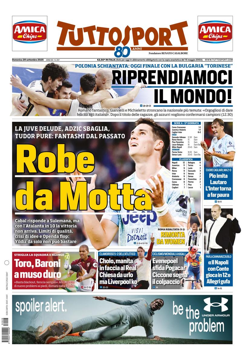 Di seguito potete trovare le prime pagine dei tre quotidiani sportivi, relativamente alle edizioni Nazionali in edicola il giorno 28 settembre 2025.