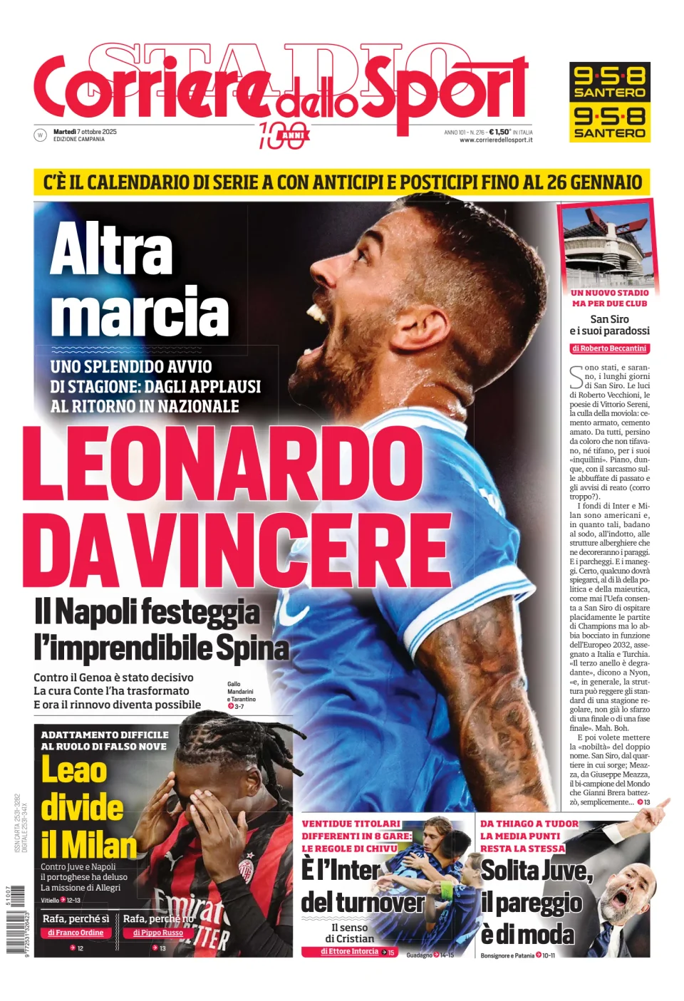 Qui di seguito vi riportiamo la prima pagina dell'edizione Campania del quotidiano 'Il Corriere dello Sport' che troverete in edicola il giorno 7 ottobre 2025.