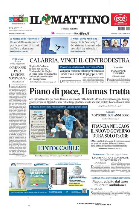 Vi riportiamo la prima pagina del quotidiano napoletano 'Il Mattino' che troverete in edicola il giorno 7 ottobre 2025.