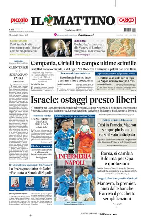 Vi riportiamo la prima pagina del quotidiano napoletano 'Il Mattino' che troverete in edicola il giorno 8 ottobre 2025.