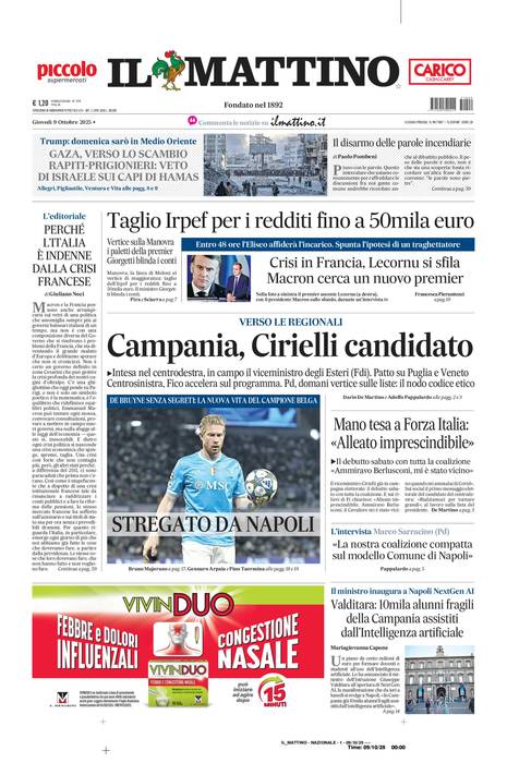 Vi riportiamo la prima pagina del quotidiano napoletano 'Il Mattino' che troverete in edicola il giorno 9 ottobre 2025.