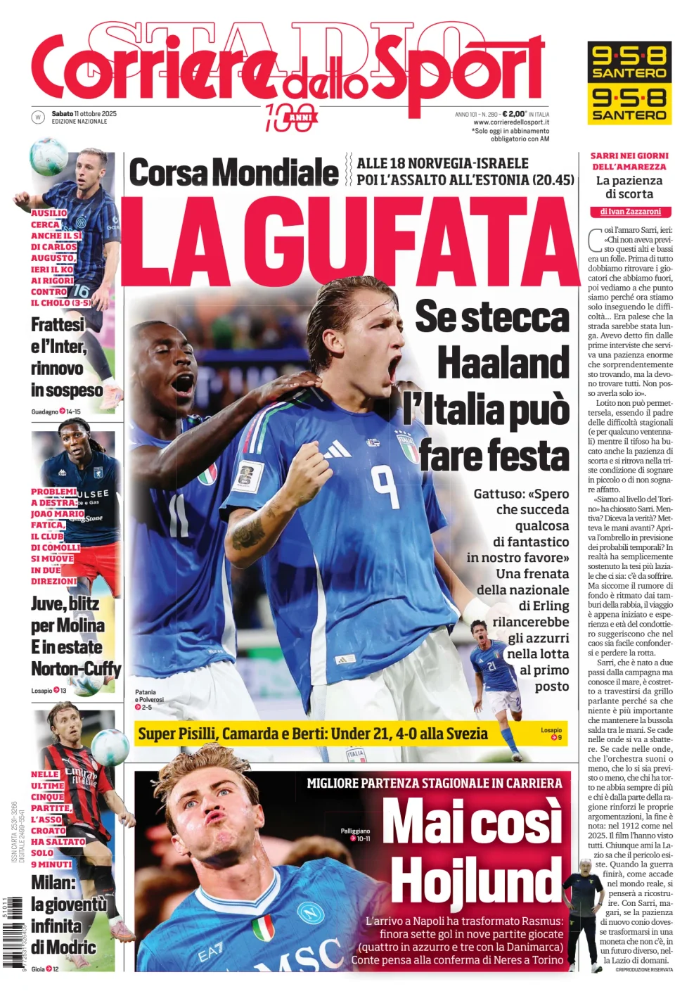 Di seguito potete trovare le prime pagine dei tre quotidiani sportivi, relativamente alle edizioni Nazionali in edicola il giorno 11 ottobre 2025.