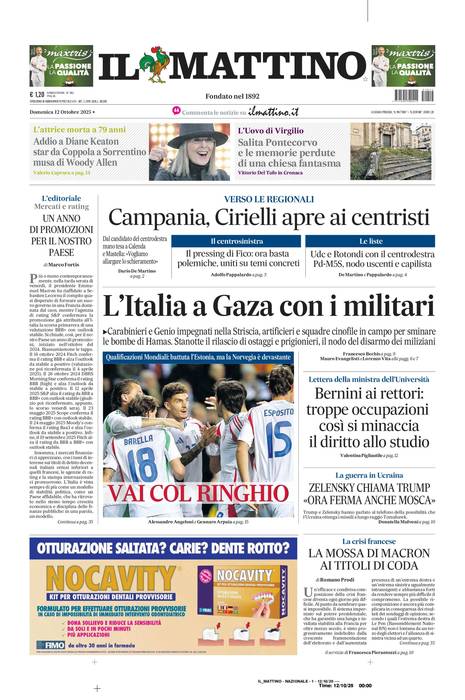 Vi riportiamo la prima pagina del quotidiano napoletano 'Il Mattino' che troverete in edicola il giorno 12 ottobre 2025.