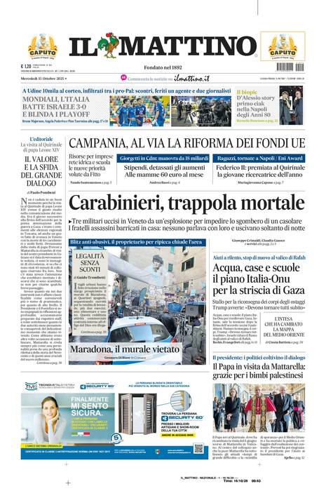 Vi riportiamo la prima pagina del quotidiano napoletano 'Il Mattino' che troverete in edicola il giorno 15 ottobre 2025.
