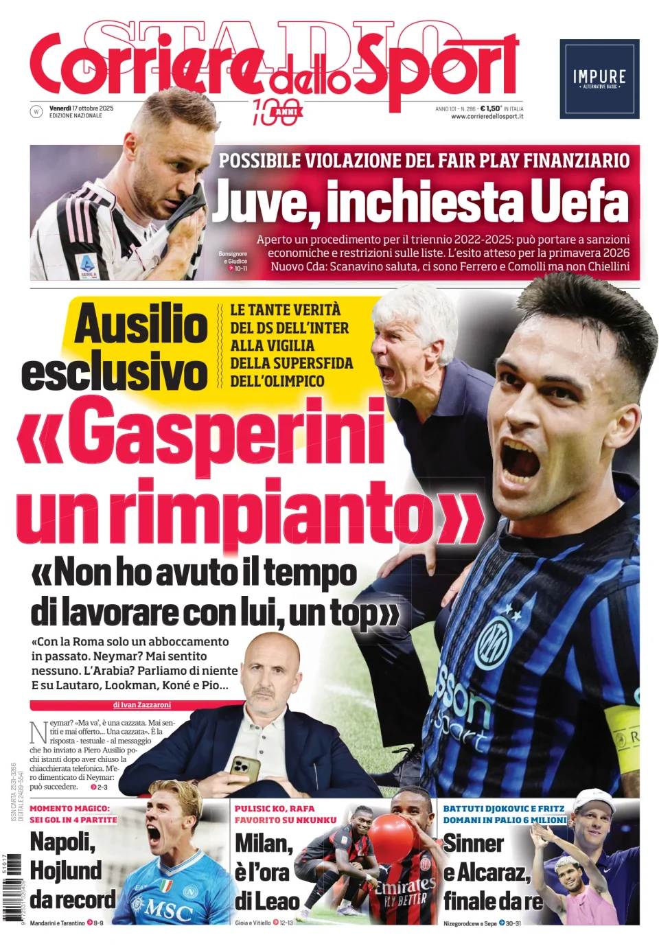 Di seguito potete trovare le prime pagine dei tre quotidiani sportivi, relativamente alle edizioni Nazionali in edicola il giorno 17 ottobre 2025.