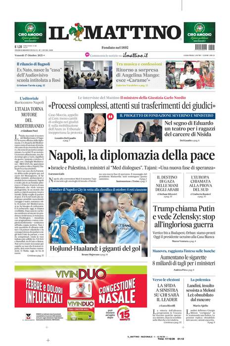Vi riportiamo la prima pagina del quotidiano napoletano 'Il Mattino' che troverete in edicola il giorno 17 ottobre 2025.