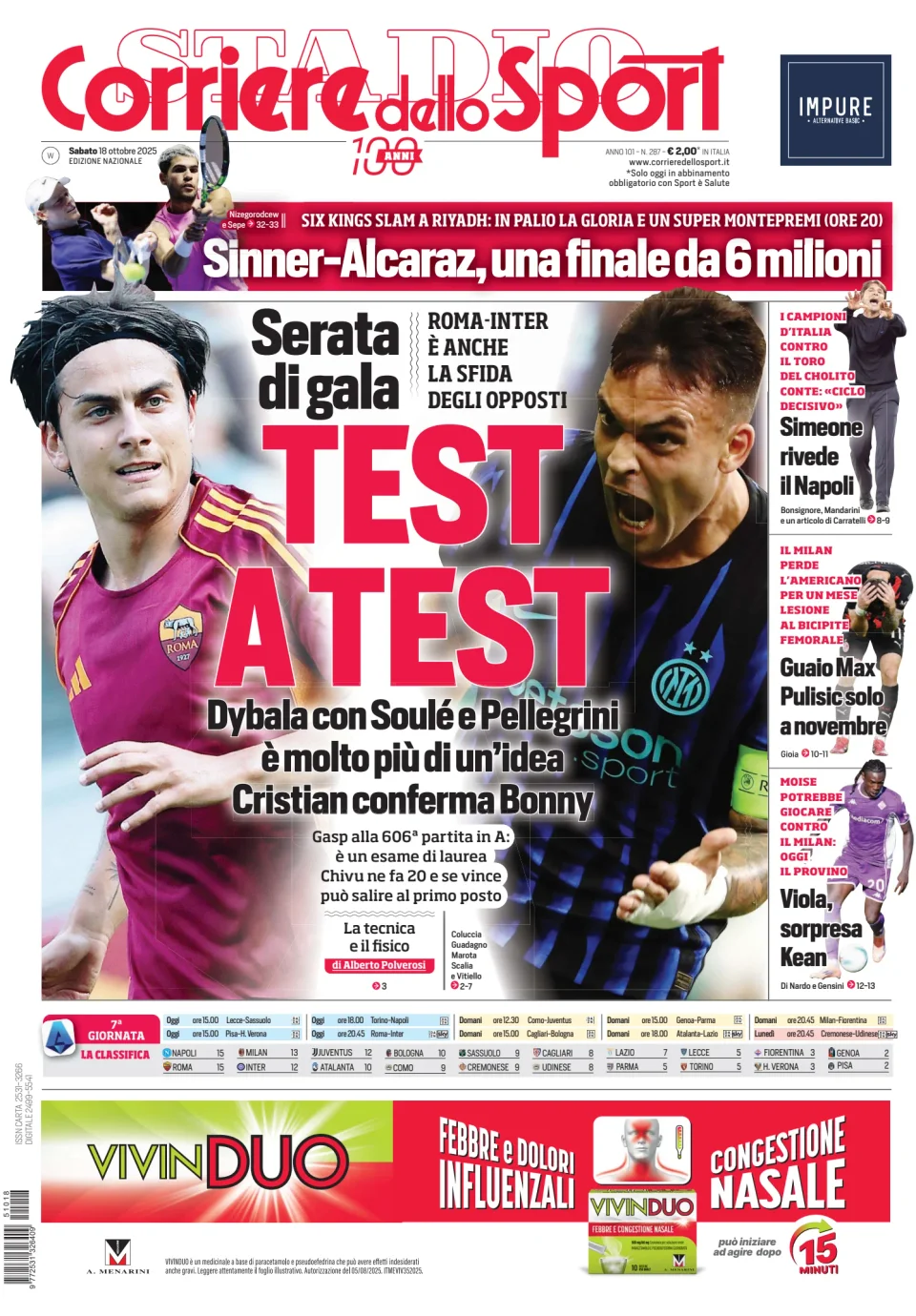 Di seguito potete trovare le prime pagine dei tre quotidiani sportivi, relativamente alle edizioni Nazionali in edicola il giorno 18 ottobre 2025.