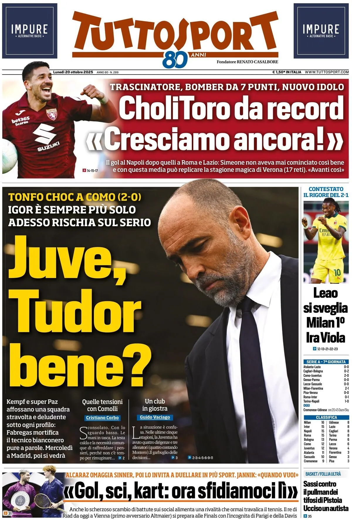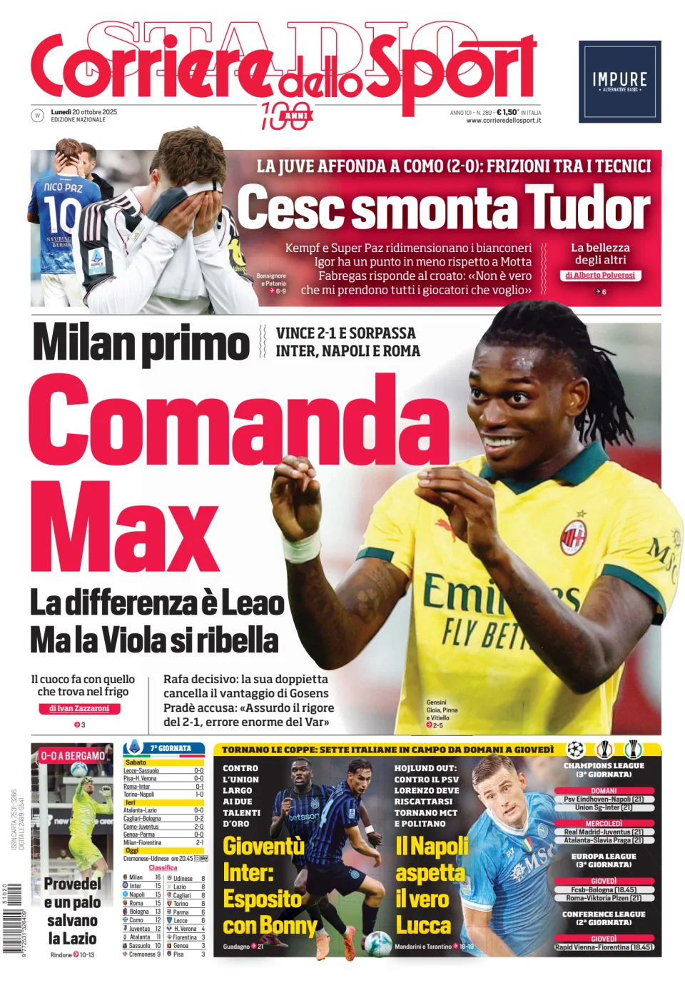 Di seguito potete trovare le prime pagine dei tre quotidiani sportivi, relativamente alle edizioni Nazionali in edicola il giorno 20 ottobre 2025.