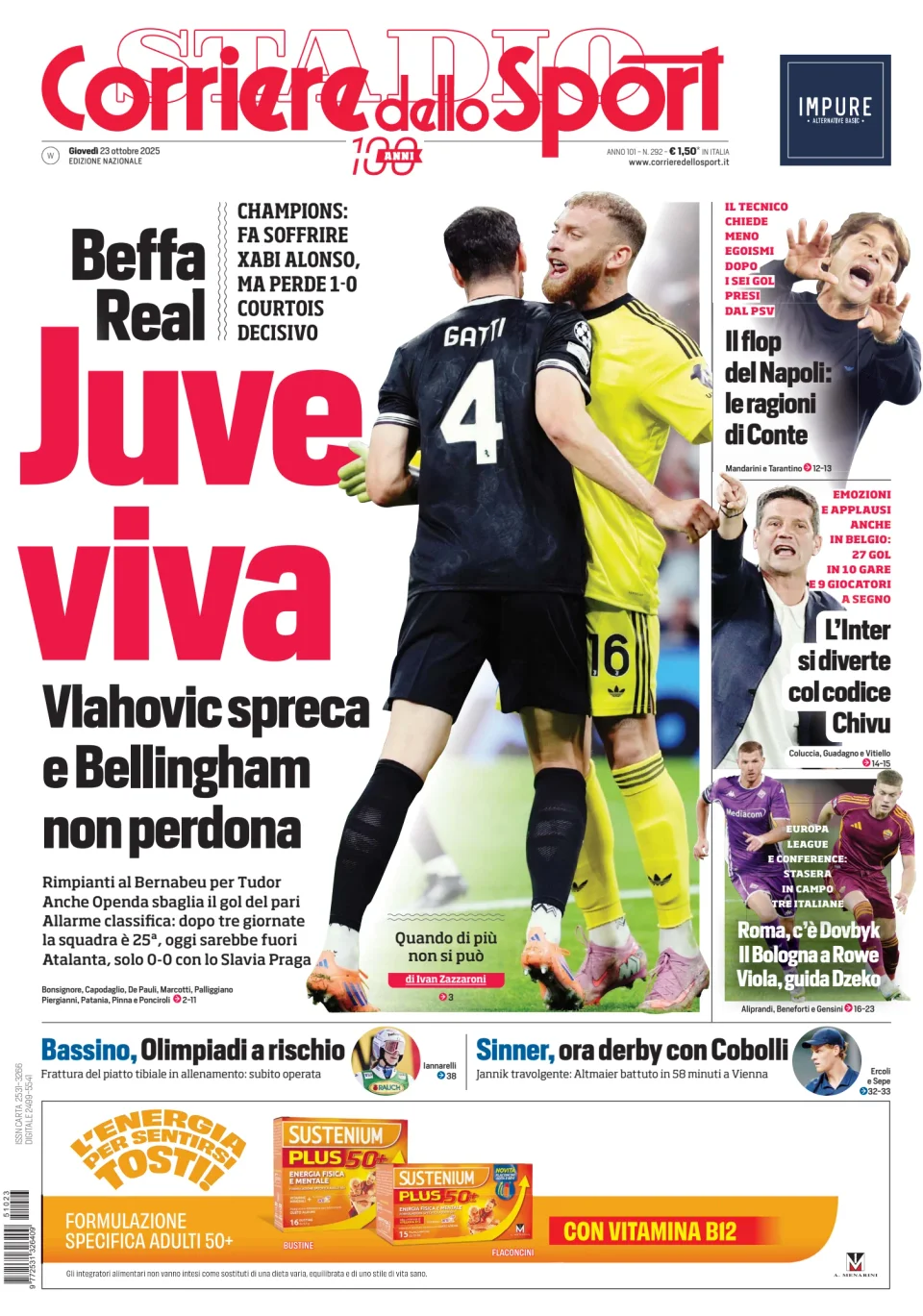 Di seguito potete trovare le prime pagine dei tre quotidiani sportivi, relativamente alle edizioni Nazionali in edicola il giorno 23 ottobre 2025.