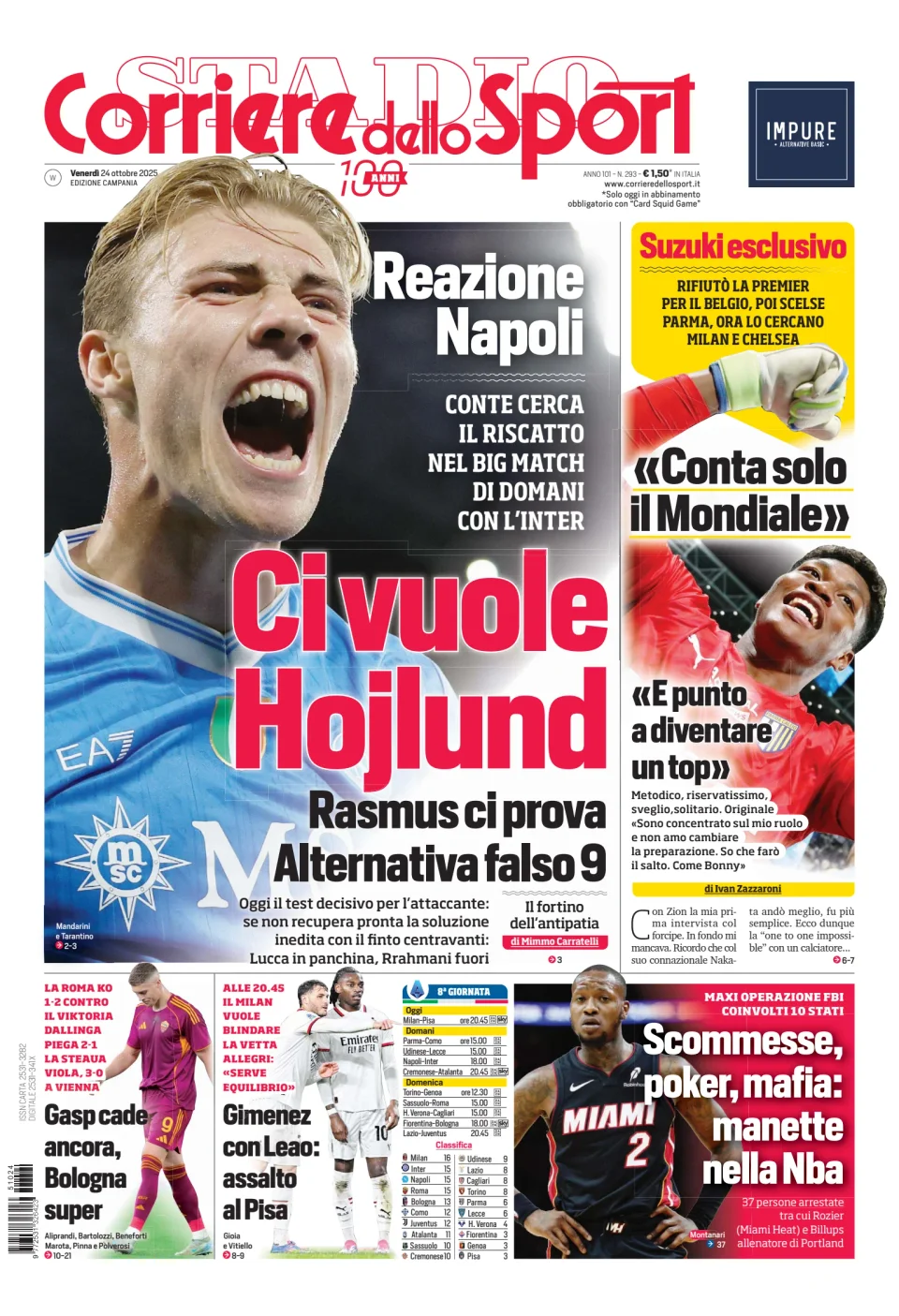 Qui di seguito vi riportiamo la prima pagina dell'edizione Campania del quotidiano 'Il Corriere dello Sport' che troverete in edicola il giorno 24 ottobre 2025.