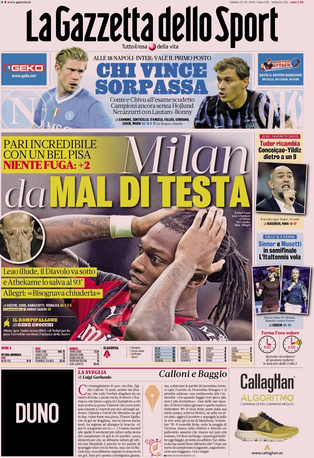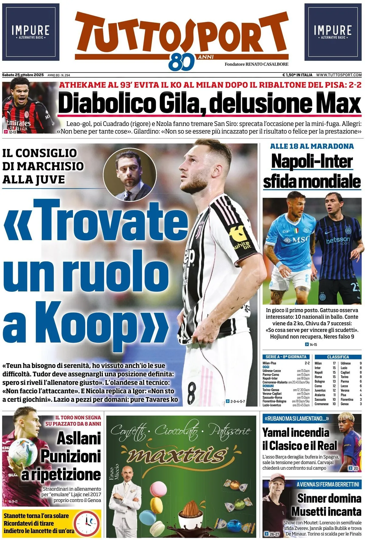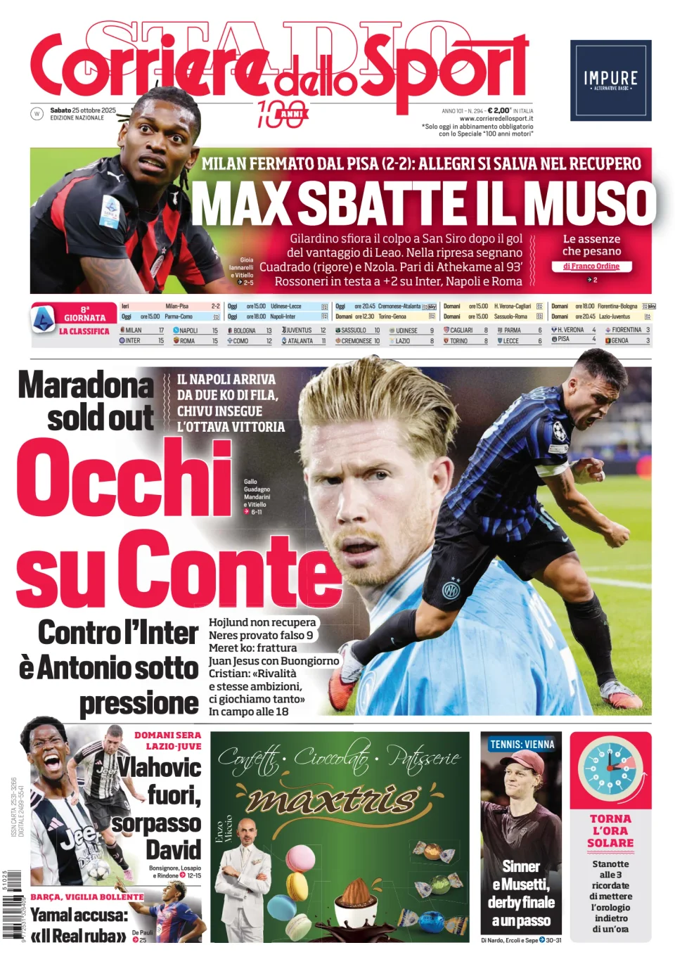Di seguito potete trovare le prime pagine dei tre quotidiani sportivi, relativamente alle edizioni Nazionali in edicola il giorno 25 ottobre 2025.