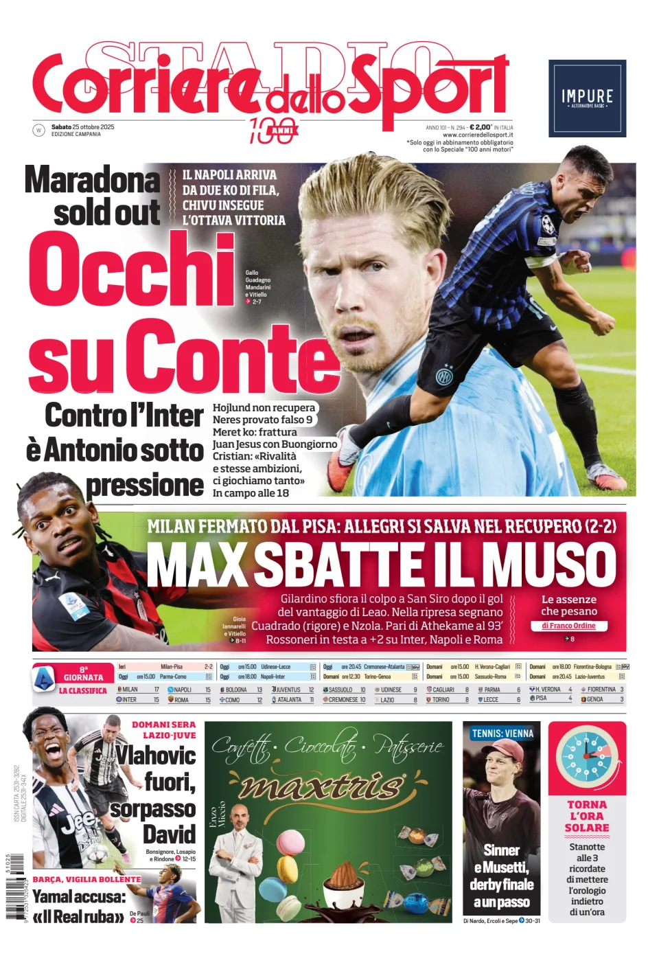 Qui di seguito vi riportiamo la prima pagina dell'edizione Campania del quotidiano 'Il Corriere dello Sport' che troverete in edicola il giorno 25 ottobre 2025.