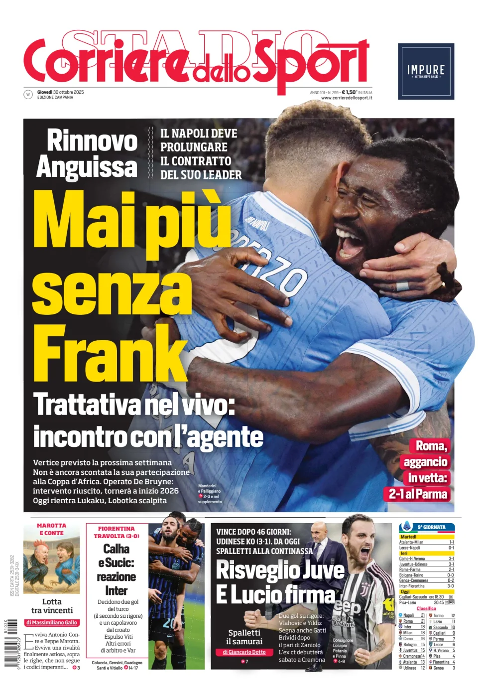 Qui di seguito vi riportiamo la prima pagina dell'edizione Campania del quotidiano 'Il Corriere dello Sport' che troverete in edicola il giorno 30 ottobre 2025.