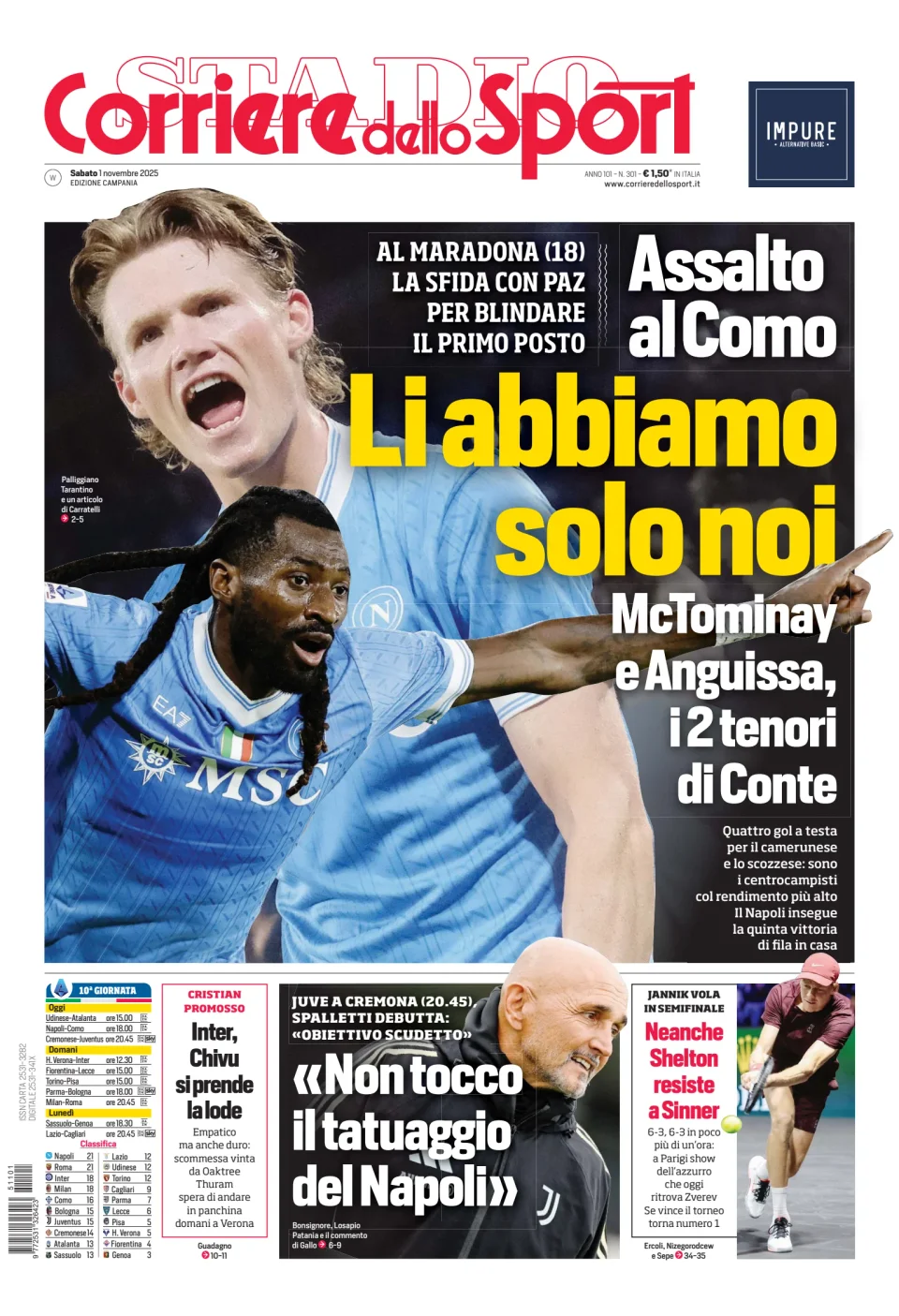 Qui di seguito vi riportiamo la prima pagina dell'edizione Campania del quotidiano 'Il Corriere dello Sport' che troverete in edicola il giorno 1 novembre 2025.