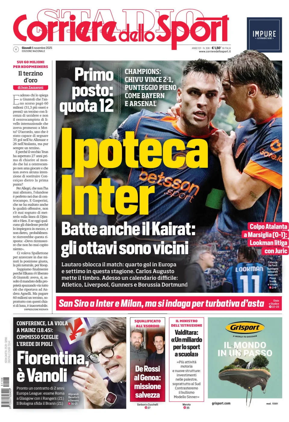 Di seguito potete trovare le prime pagine dei tre quotidiani sportivi, relativamente alle edizioni Nazionali in edicola il giorno 6 novembre 2025.
