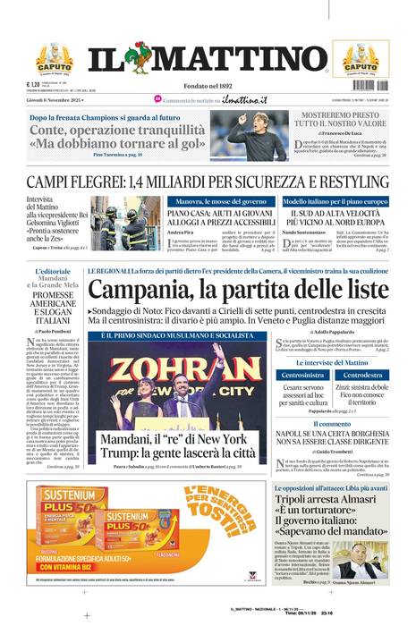 Vi riportiamo la prima pagina del quotidiano napoletano 'Il Mattino' che troverete in edicola il giorno 6 novembre 2025.