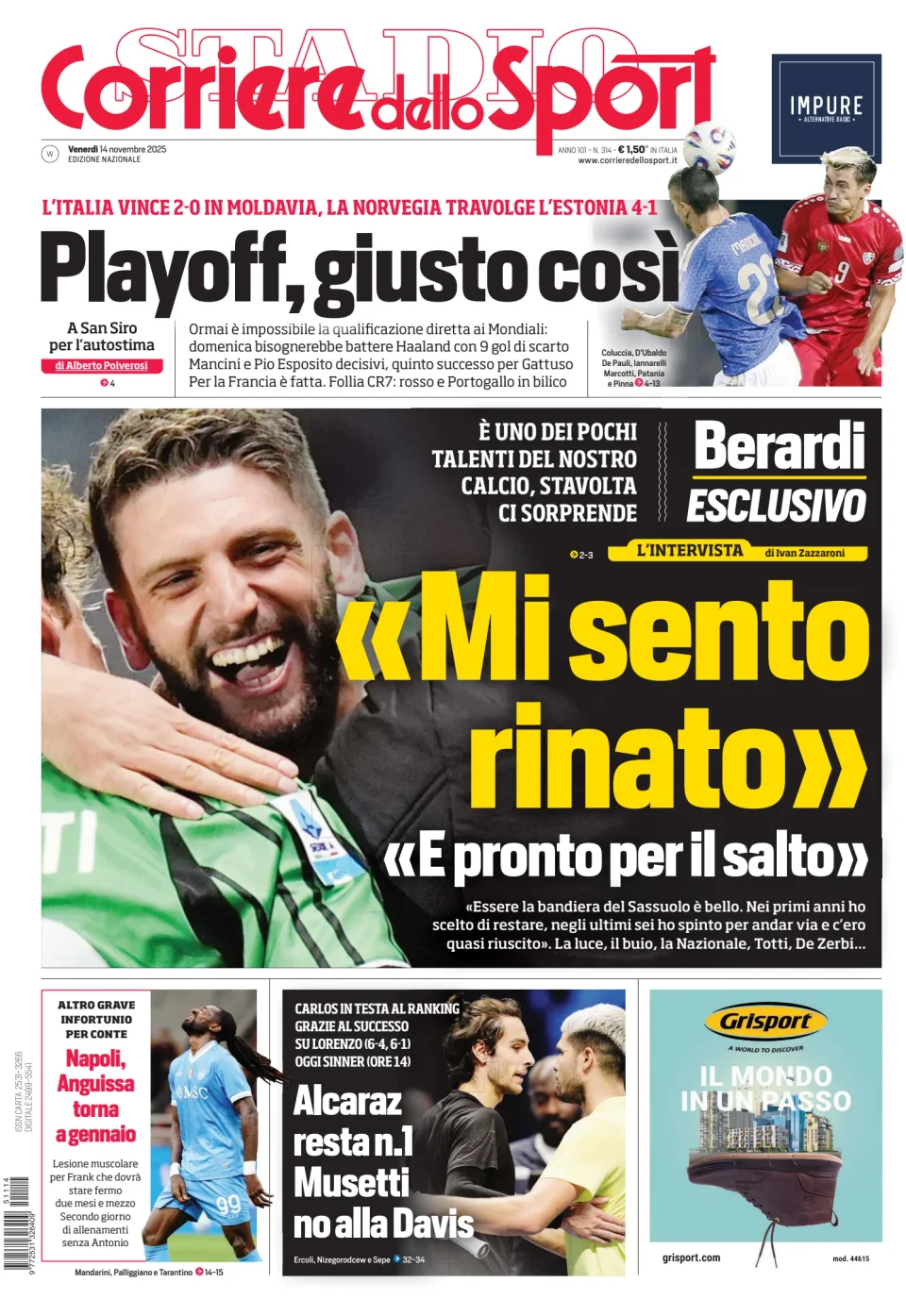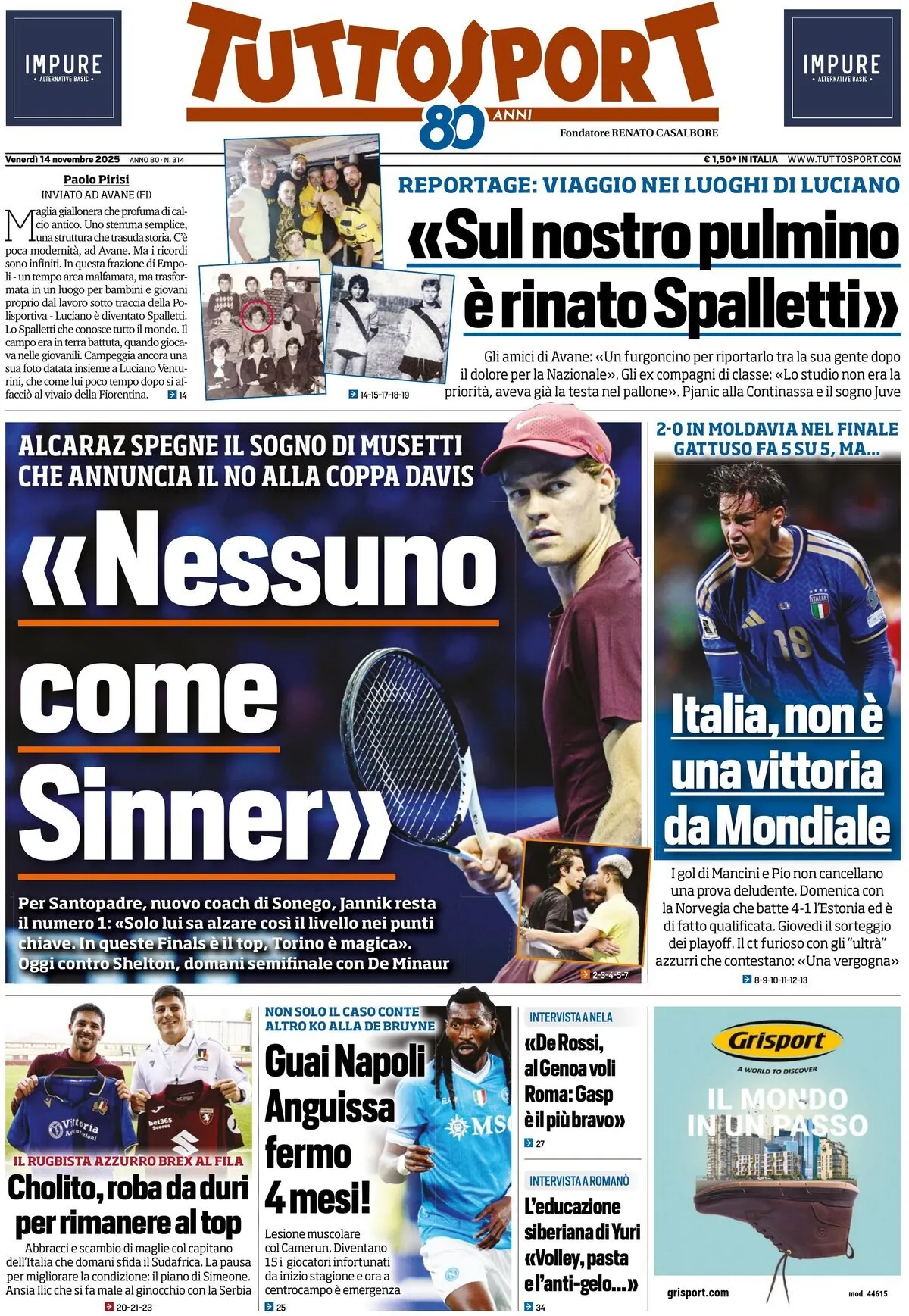 Di seguito potete trovare le prime pagine dei tre quotidiani sportivi, relativamente alle edizioni Nazionali in edicola il giorno 14 novembre 2025.