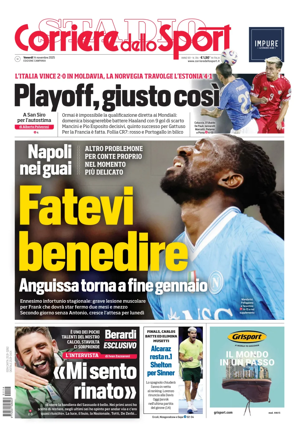 Qui di seguito vi riportiamo la prima pagina dell'edizione Campania del quotidiano 'Il Corriere dello Sport' che troverete in edicola il giorno 14 novembre 2025.