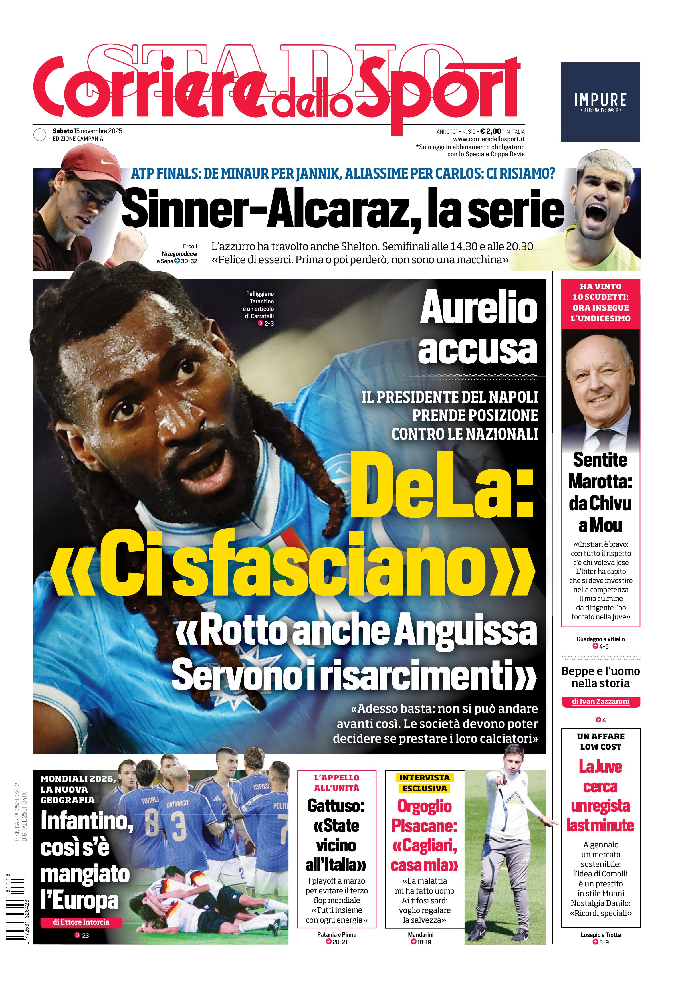 Qui di seguito vi riportiamo la prima pagina dell'edizione Campania del quotidiano 'Il Corriere dello Sport' che troverete in edicola il giorno 15 novembre 2025.