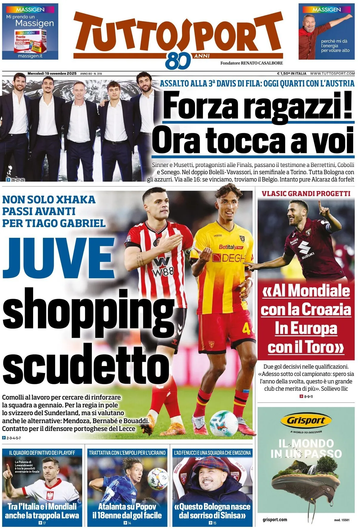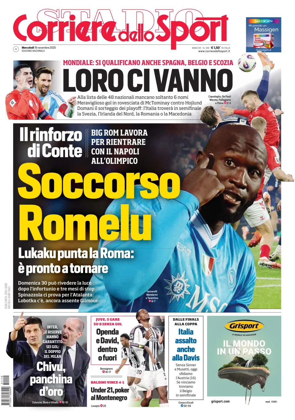 Di seguito potete trovare le prime pagine dei tre quotidiani sportivi, relativamente alle edizioni Nazionali in edicola il giorno 19 novembre 2025.