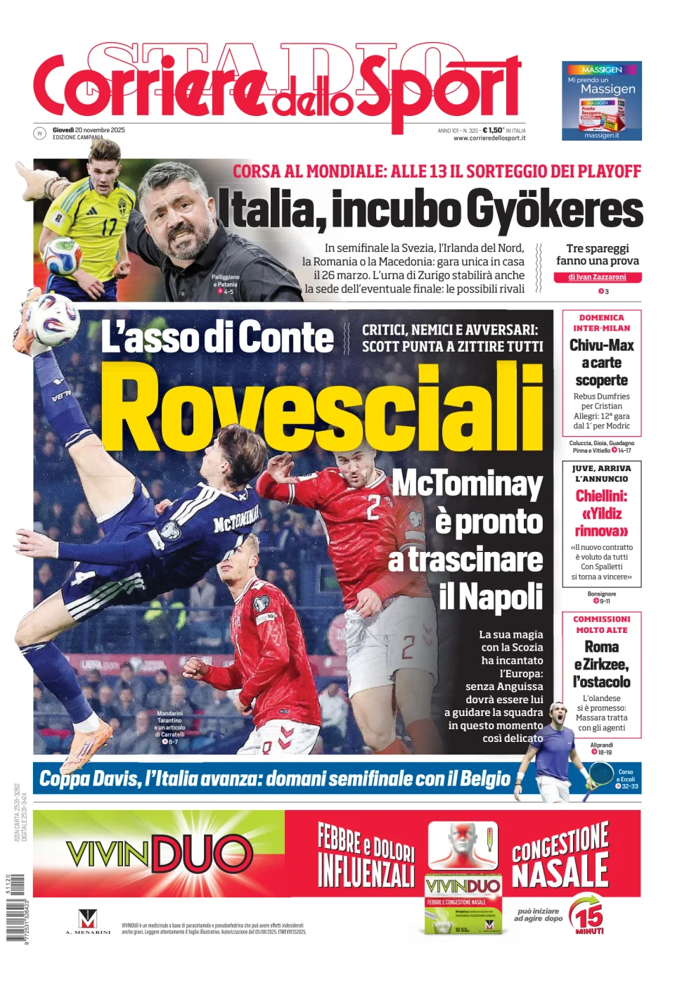 Qui di seguito vi riportiamo la prima pagina dell'edizione Campania del quotidiano 'Il Corriere dello Sport' che troverete in edicola il giorno 20 novembre 2025.