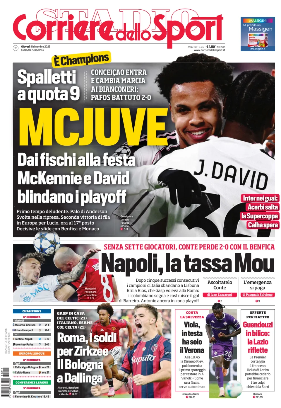 Di seguito potete trovare le prime pagine dei tre quotidiani sportivi, relativamente alle edizioni Nazionali in edicola il giorno 11 dicembre 2025.
