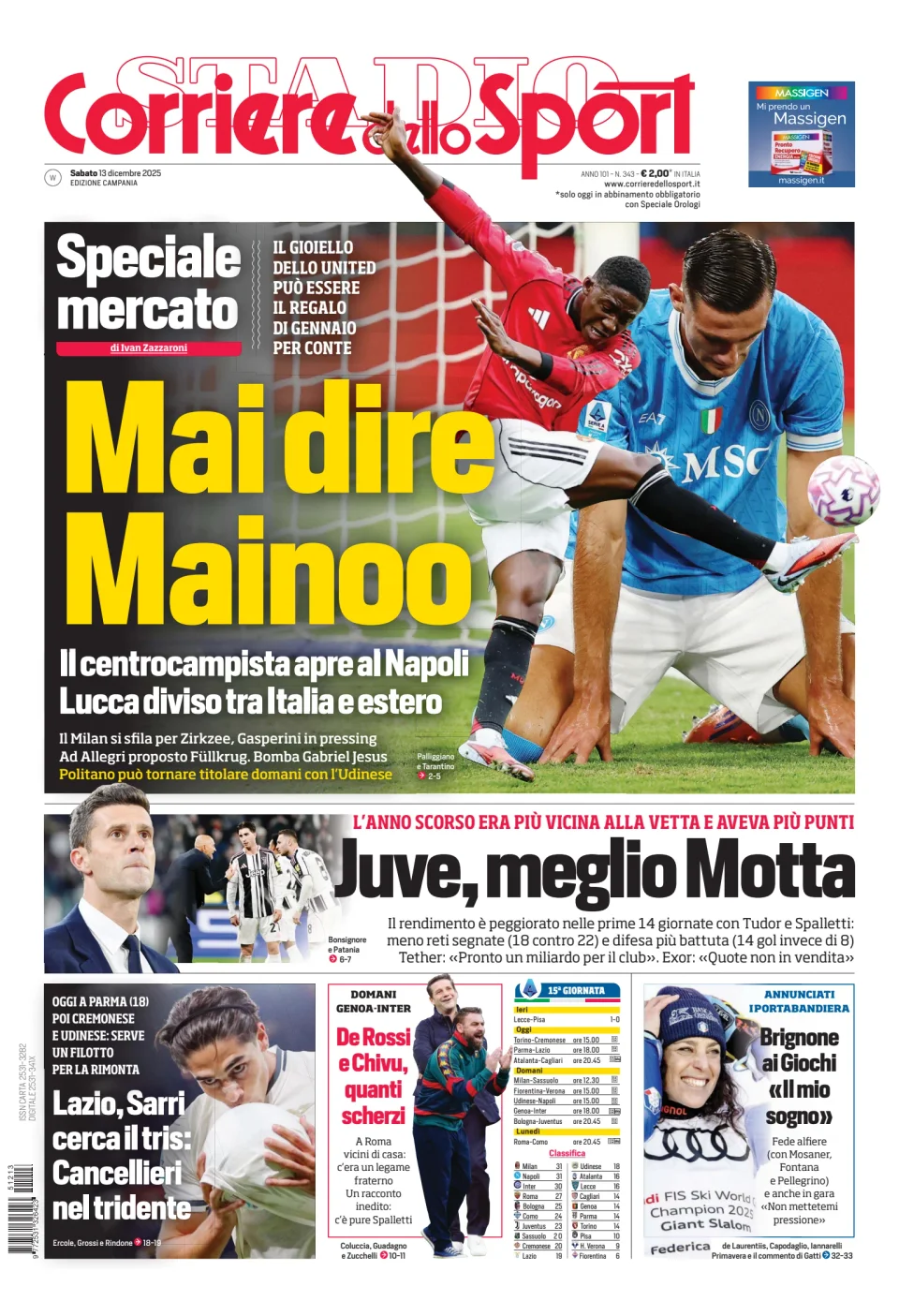 Qui di seguito vi riportiamo la prima pagina dell'edizione Campania del quotidiano 'Il Corriere dello Sport' che troverete in edicola il giorno 13 dicembre 2025.