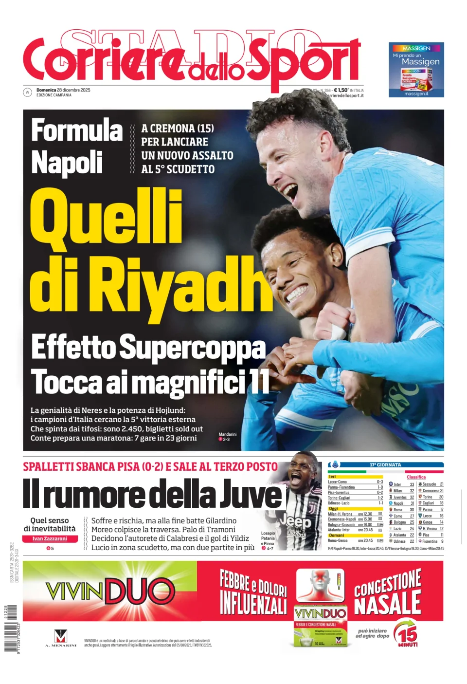 Qui di seguito vi riportiamo la prima pagina dell'edizione Campania del quotidiano 'Il Corriere dello Sport' che troverete in edicola il giorno 28 dicembre 2025.